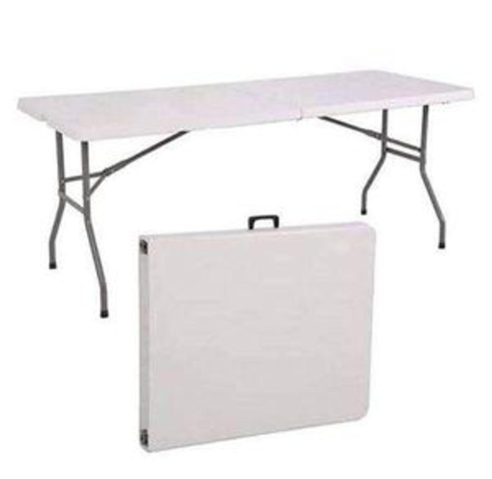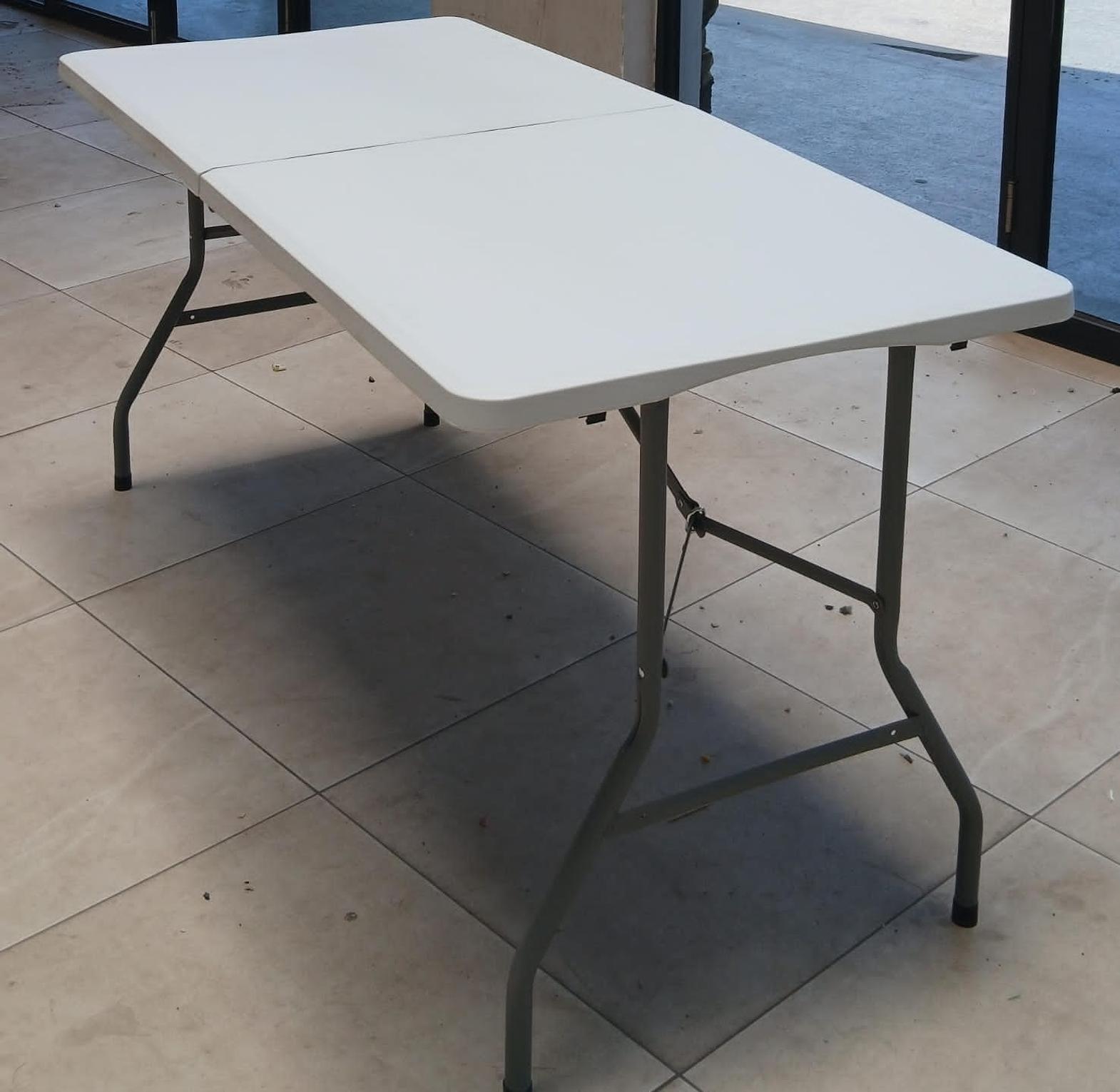 Material: The tabletop is typically made from high-density polyethylene (HDPE) plastic, which is waterproof, stain-resistant, and easy to clean. The frame and legs are constructed from durable, powder-coated steel for stability and rust resistance. Design: It features a foldable design where the legs tuck in and the table often folds in half down the center, transforming into a compact format for easy storage and transport. Some models include a built-in carrying handle. Durability: The materials are weather-resistant and UV-protected, making the table suitable for various environments without cracking, peeling, or fading.