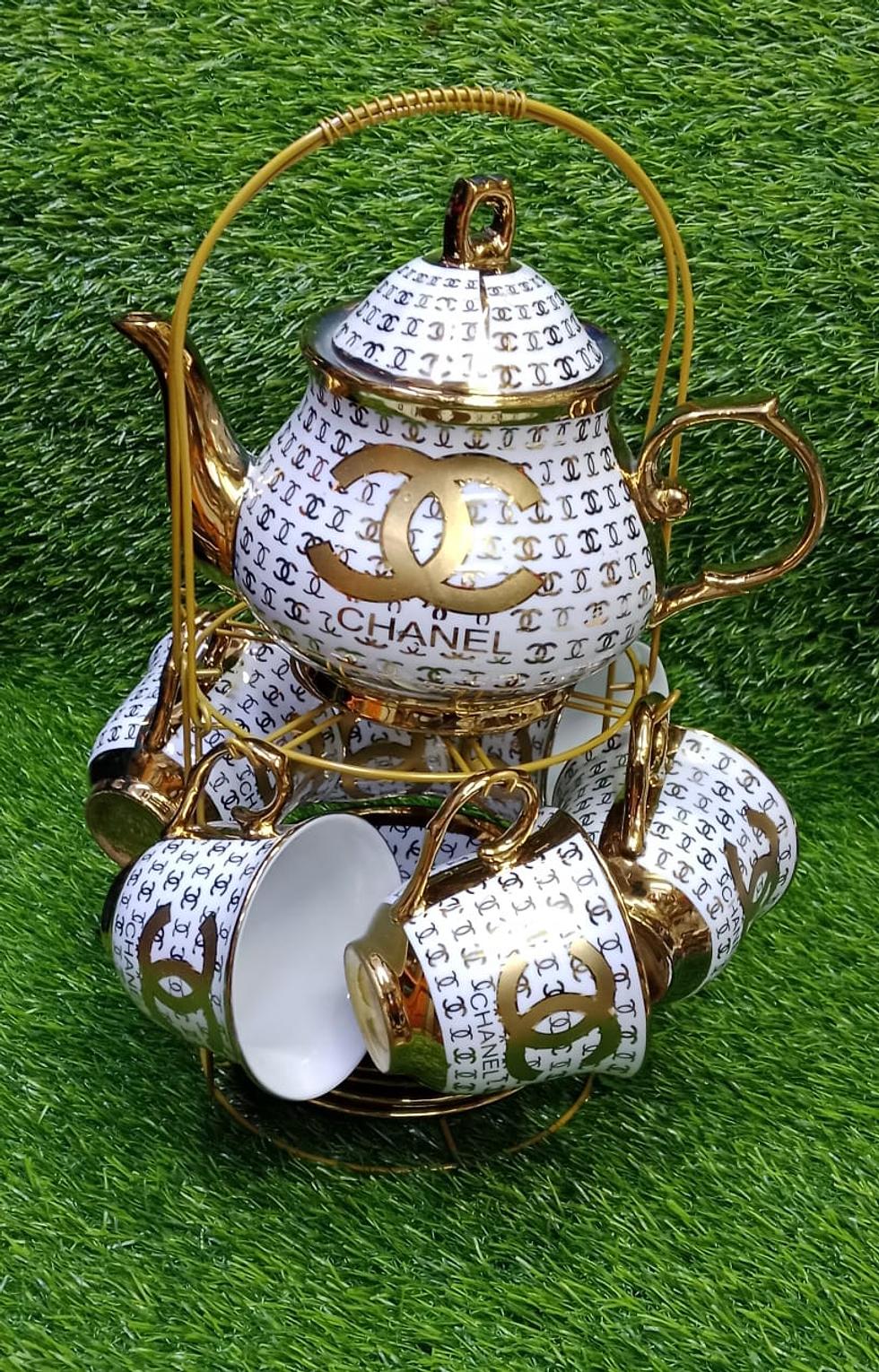 This tea set typically includes a teapot with a lid and multiple cups, often accompanied by saucers and a stand for display and storage. The set features a white and gold color scheme with prominent "CHANEL" branding and the iconic interlocking C logo repeated across the surfaces of the teapot and cups. The teapot has a capacity of around 500ml, and each cup holds approximately 100ml. The set is designed for serving tea and can be used for decorative purposes or for hosting tea gatherings