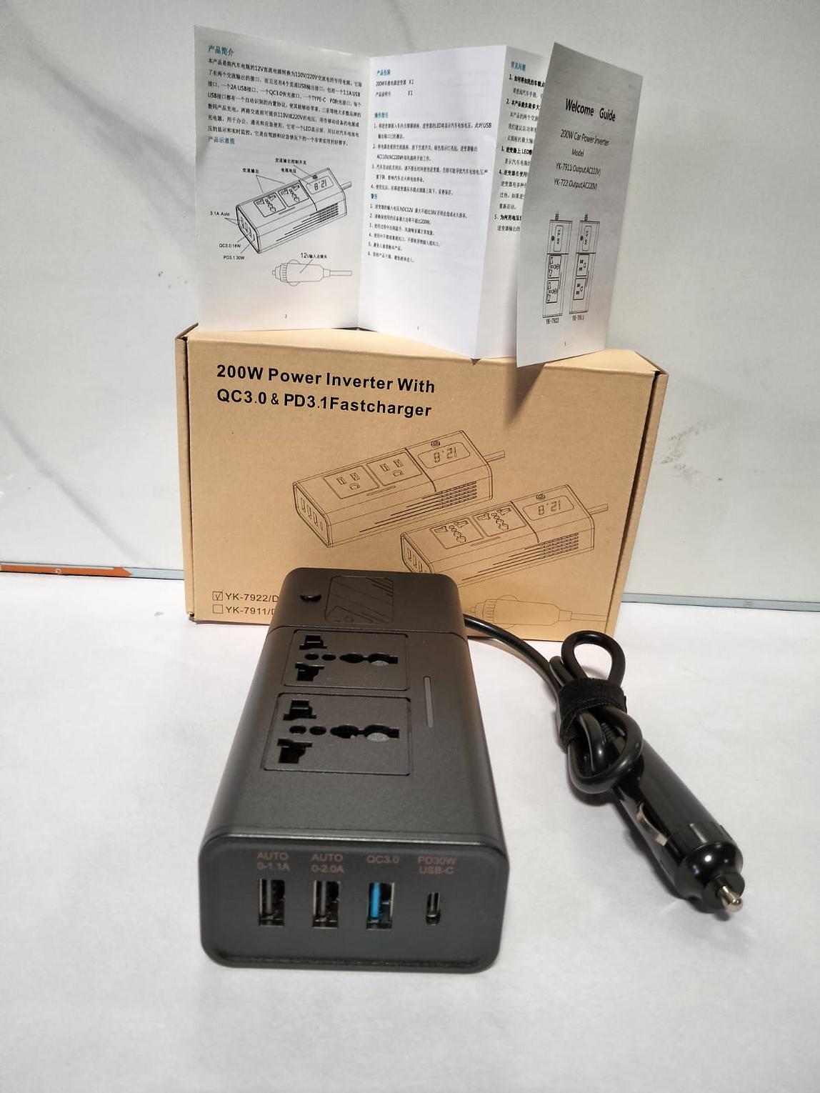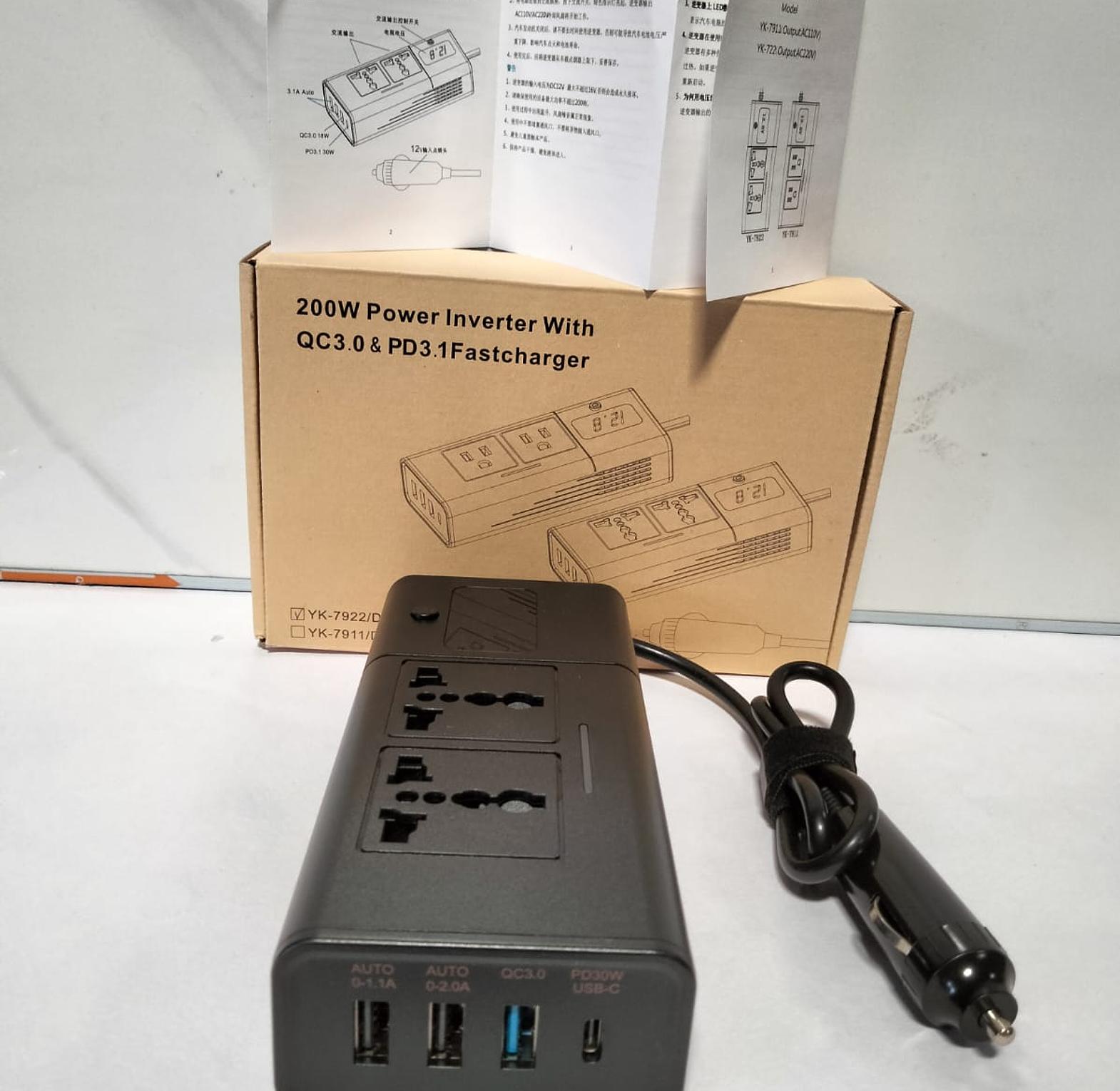 It is a device designed to convert a vehicle's 12V DC power into AC power for operating various electronics, and it includes fast-charging capabilities. The inverter features multiple ports for charging different devices simultaneously. It has a durable build, often with an aluminum case for heat dissipation. The front panel of the device shows several outlets and ports.