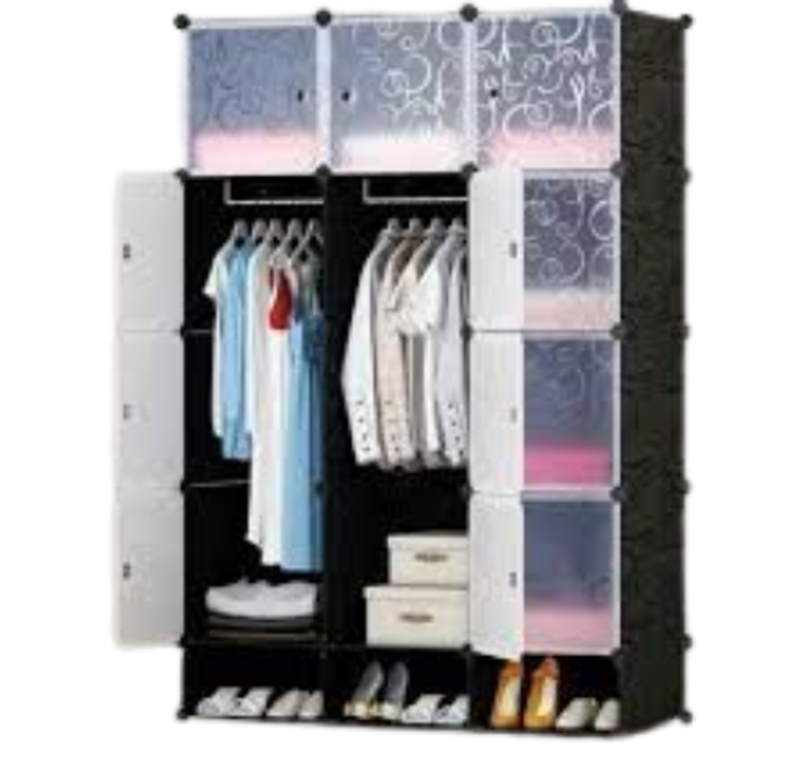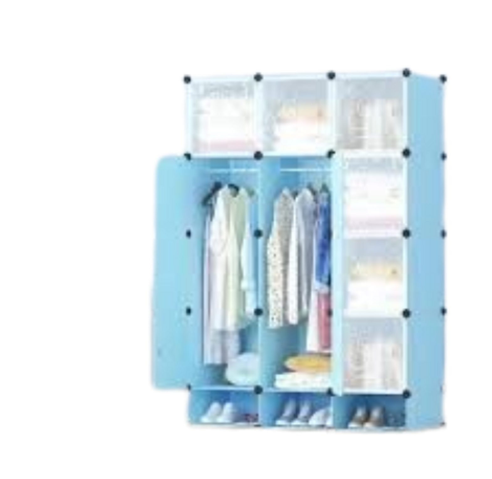 Specifications and Descriptions: Name: Often referred to as a "3-Column Plastic Wardrobe" or "Portable Plastic Wardrobe". Material: Constructed from durable, high-quality plastic panels, steel frames, and plastic connectors. Design: Features a modular, cube-based design with multiple compartments, including sections for hanging clothes and shelves for folded items, shoes, or other belongings. Each cube typically has a door to protect contents from dust and humidity.