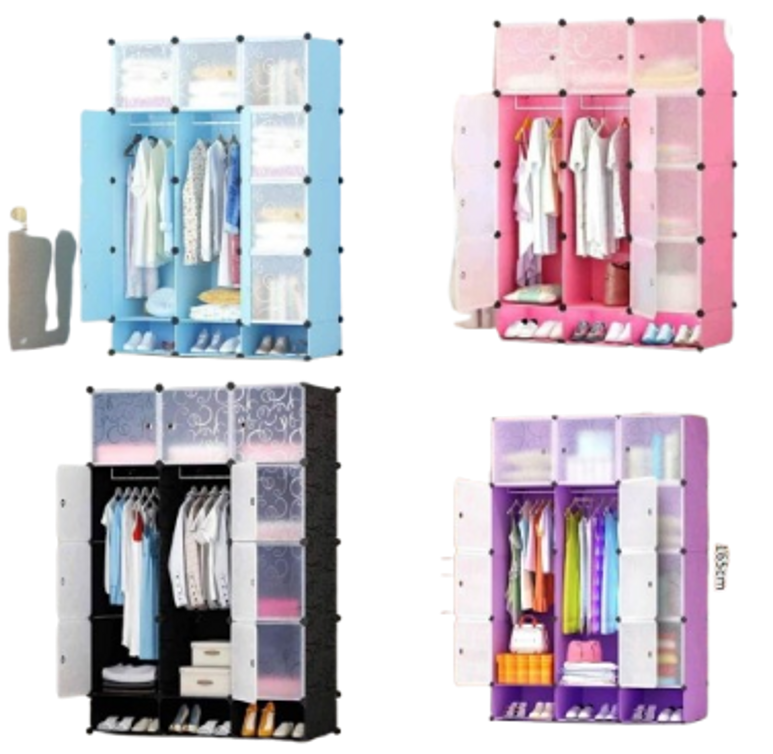 This item is a smart, spacious, and affordable storage solution designed for organizing clothes, shoes, and accessories in various settings such as bedrooms, dorms, or rental spaces. It features a modern, space-saving design and is available in multiple colors including blue, pink, black, and purple, as seen in the image. The design includes dustproof and waterproof doors to keep contents clean and protected.