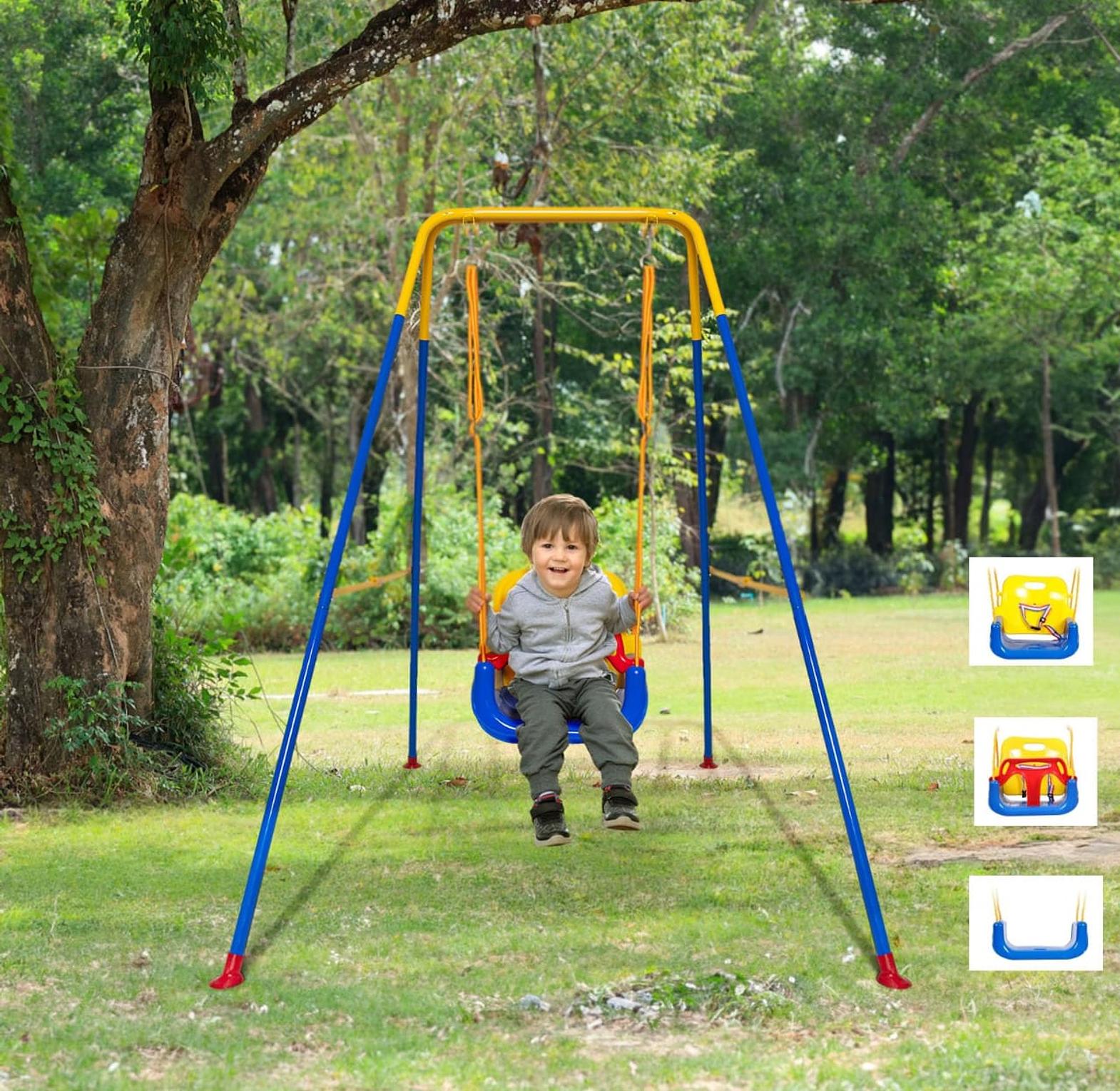 This versatile swing set is designed to grow with a child, converting into three different modes to accommodate ages from 6 months up to 10 years old. It is suitable for both indoor and outdoor use and features a foldable metal stand for easy storage.