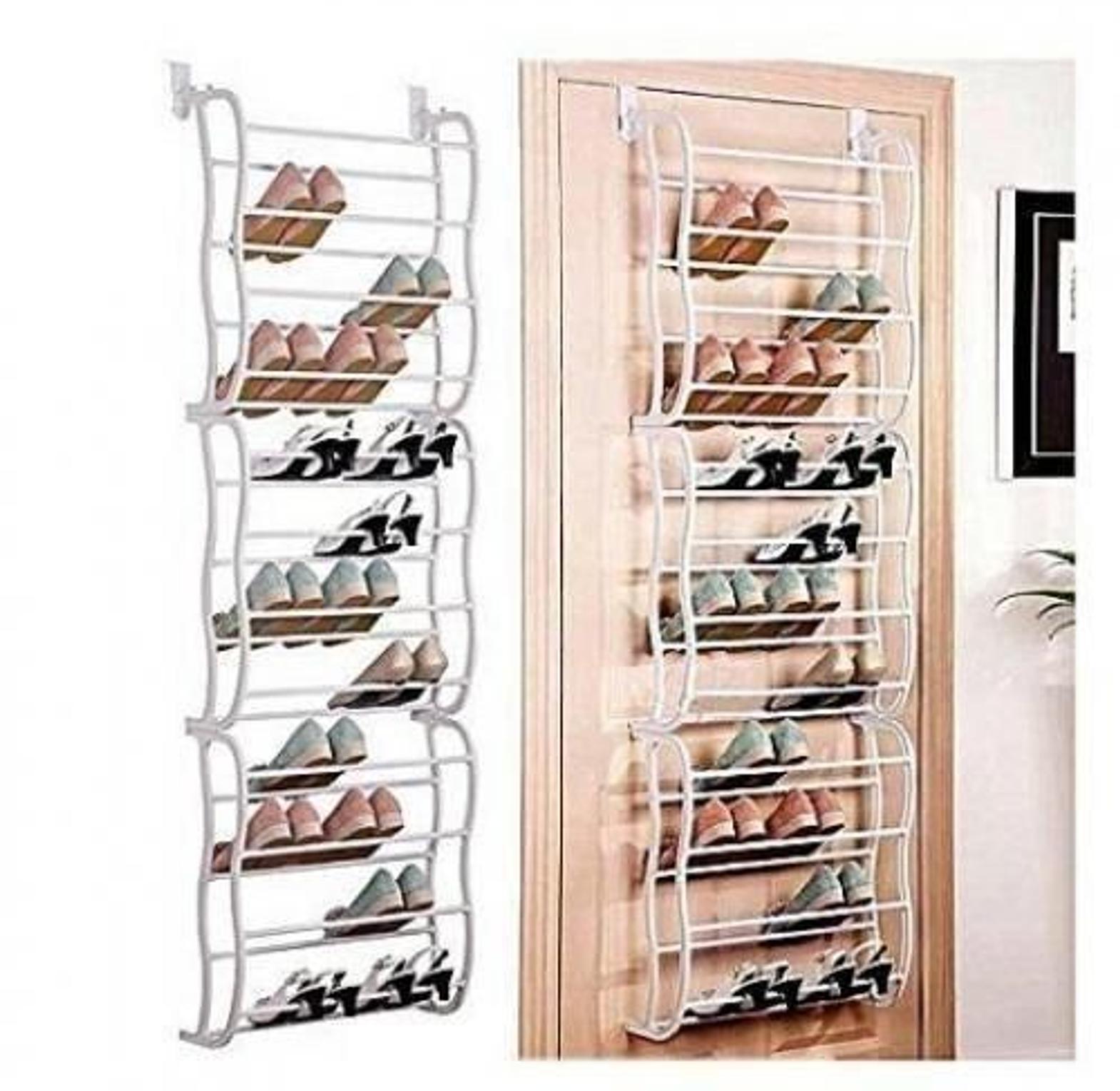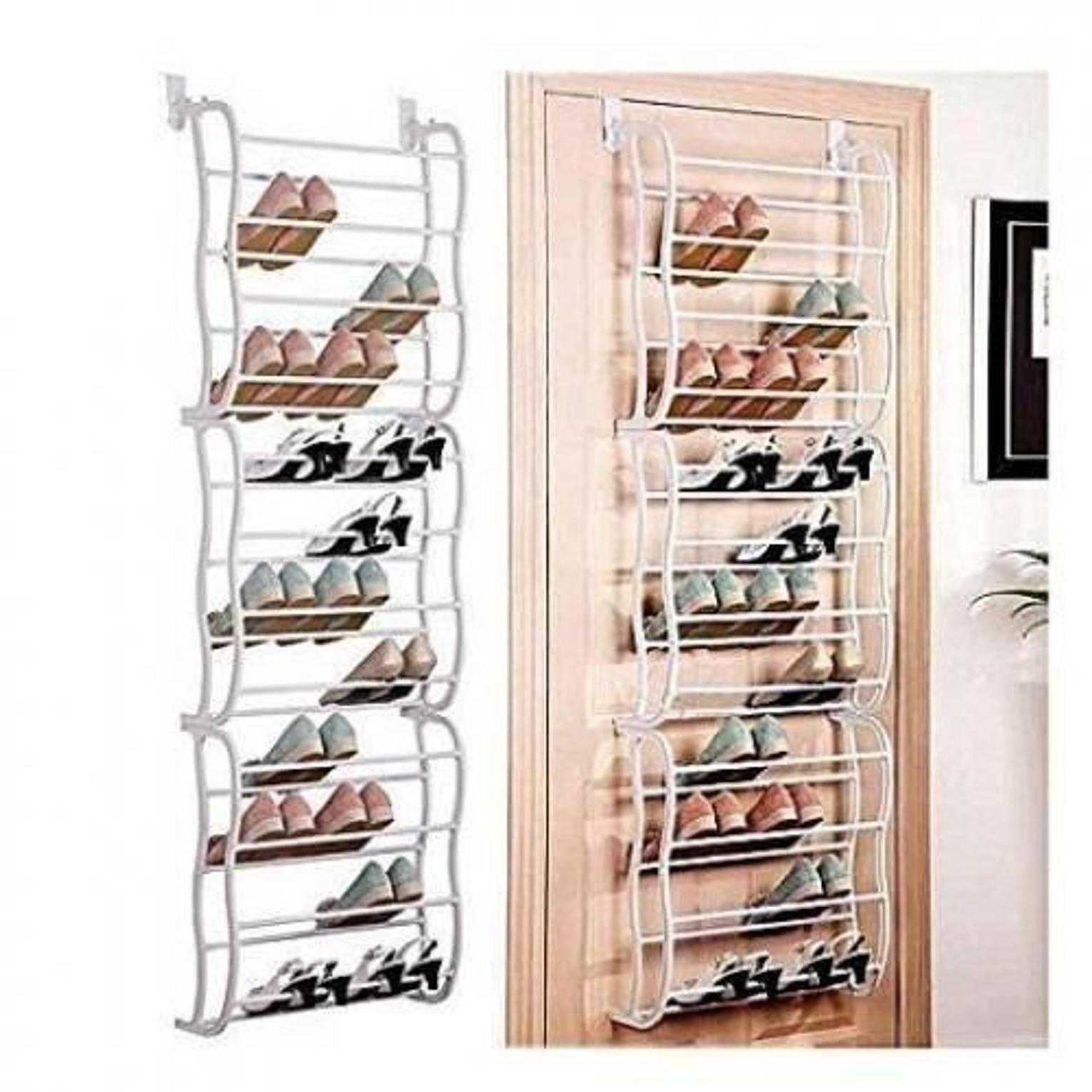 The hanging shoe storage has 3 modular interlocking segments, each holding 12 pairs of shoes.The men and ladies shoe storage gives you freedom to choose using 1, 2 or 3 segments depending on your needs holding 12, 24 or 36 pairs of shoes.With this door shoe rack you'll be able to clearly view your shoe collection for easy selection every morning.Dimensions of the thin shoe rack:180cm (H) x 57cm (W) x 19cm (D)The plate that hangs the flat shoe storage over the door is only about 1mm so is thin enough to let your door still close perfectly.Please Note: The shoe storage solutions comes flat packed and unassembled but the over the door shoe storage is incredibly simple to install with no tools required.The slim shoe rack fits perfectly to the door, but it is advisable to fix it with screws if it is mounted on a door that is widely used or is slammed