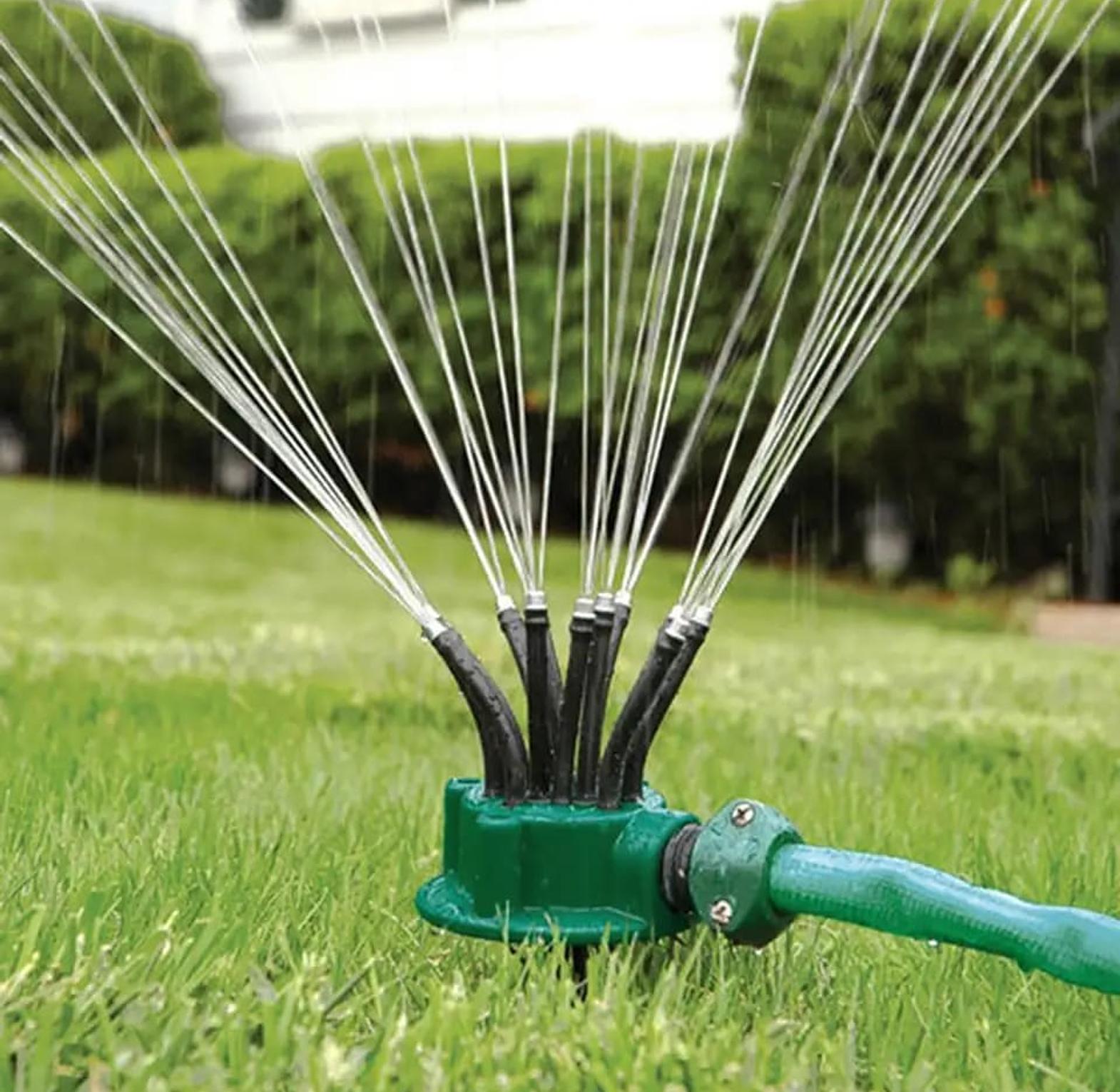 This versatile irrigation tool is designed for precise, customizable watering of gardens, lawns, and flower beds. It features 12 flexible "noodle" hoses that can be bent and positioned in any direction, allowing you to target specific areas or odd-shaped sections of your yard without wasting water on sidewalks or driveways. It typically mounts to a ground spike or a flat base and connects directly to a standard garden hose.