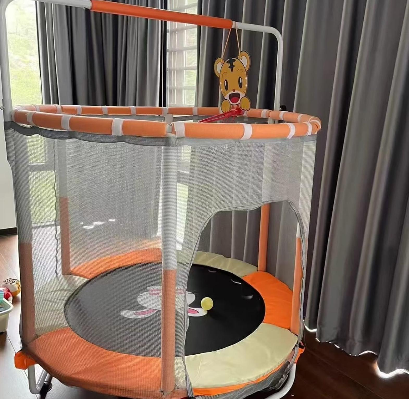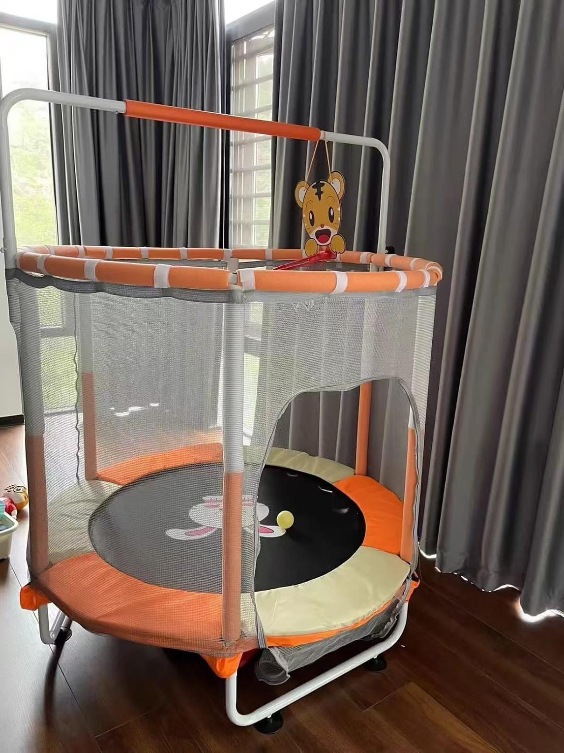 This model is a compact, round trampoline featuring a 360-degree safety enclosure net to prevent falls during play. It is supported by a heavy-duty frame and includes padded poles for extra protection. A distinctive feature of this unit is the adjustable horizontal bar that can be used for hanging accessories like gymnastics rings or swings, allowing it to function as both a trampoline and a mini-gym. The jumping mat is typically made of high-elasticity PP material for a consistent bounce