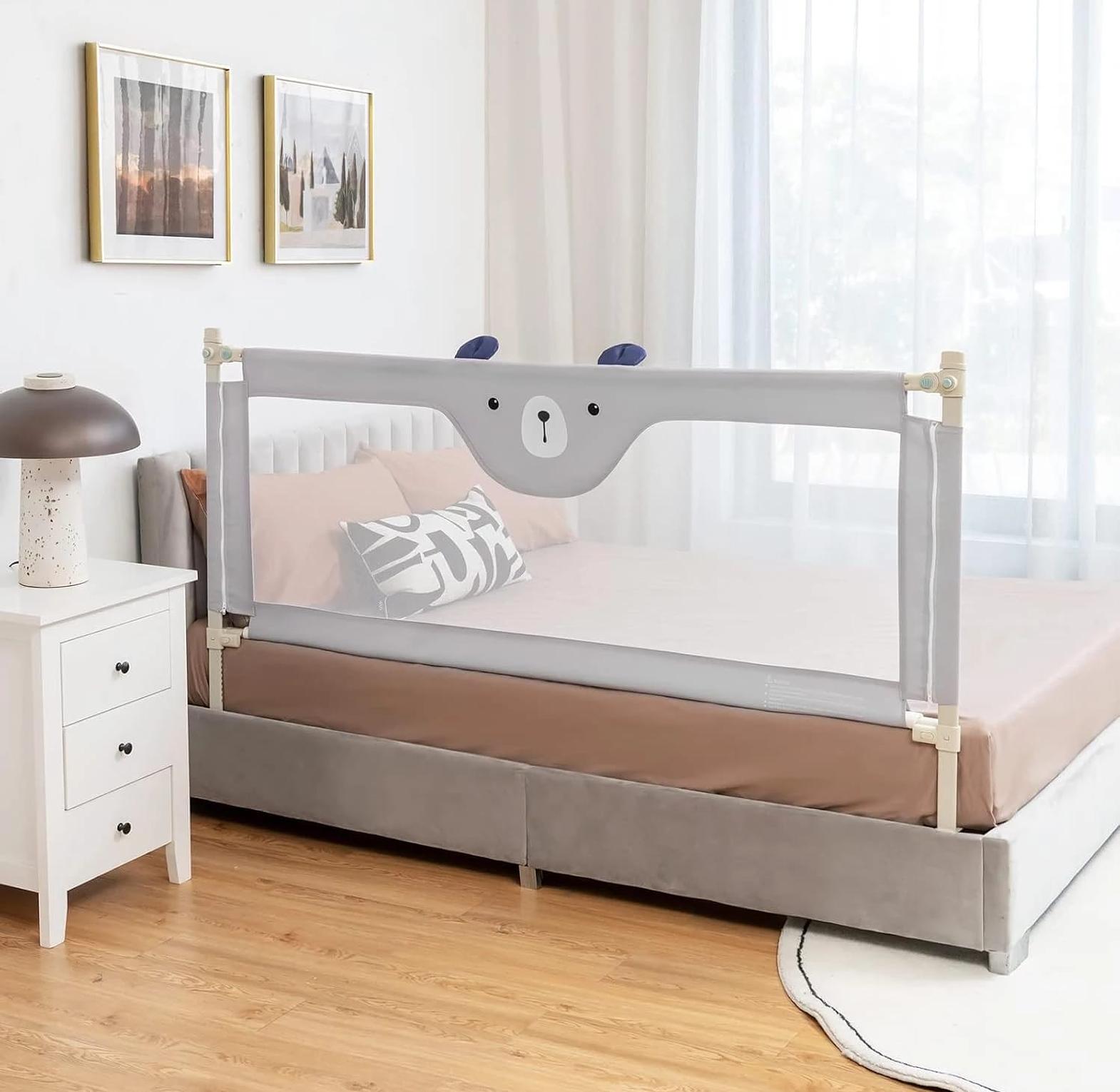 Vertical Lifting Mechanism: Features a space-saving vertical lift that allows the rail to slide down easily, providing convenient access to the bed for parents without having to remove the entire guard. Breathable Safety Mesh: The large center panel is made of high-quality, transparent mesh, ensuring optimal airflow and allowing parents to monitor their child at all times. Double Safety Lock: Equipped with a dual-locking system that requires a specific sequence to unlock, preventing curious toddlers from accidentally lowering the rail. Seamless Design: Designed to press firmly against the mattress to eliminate dangerous gaps where a child could potentially get stuck