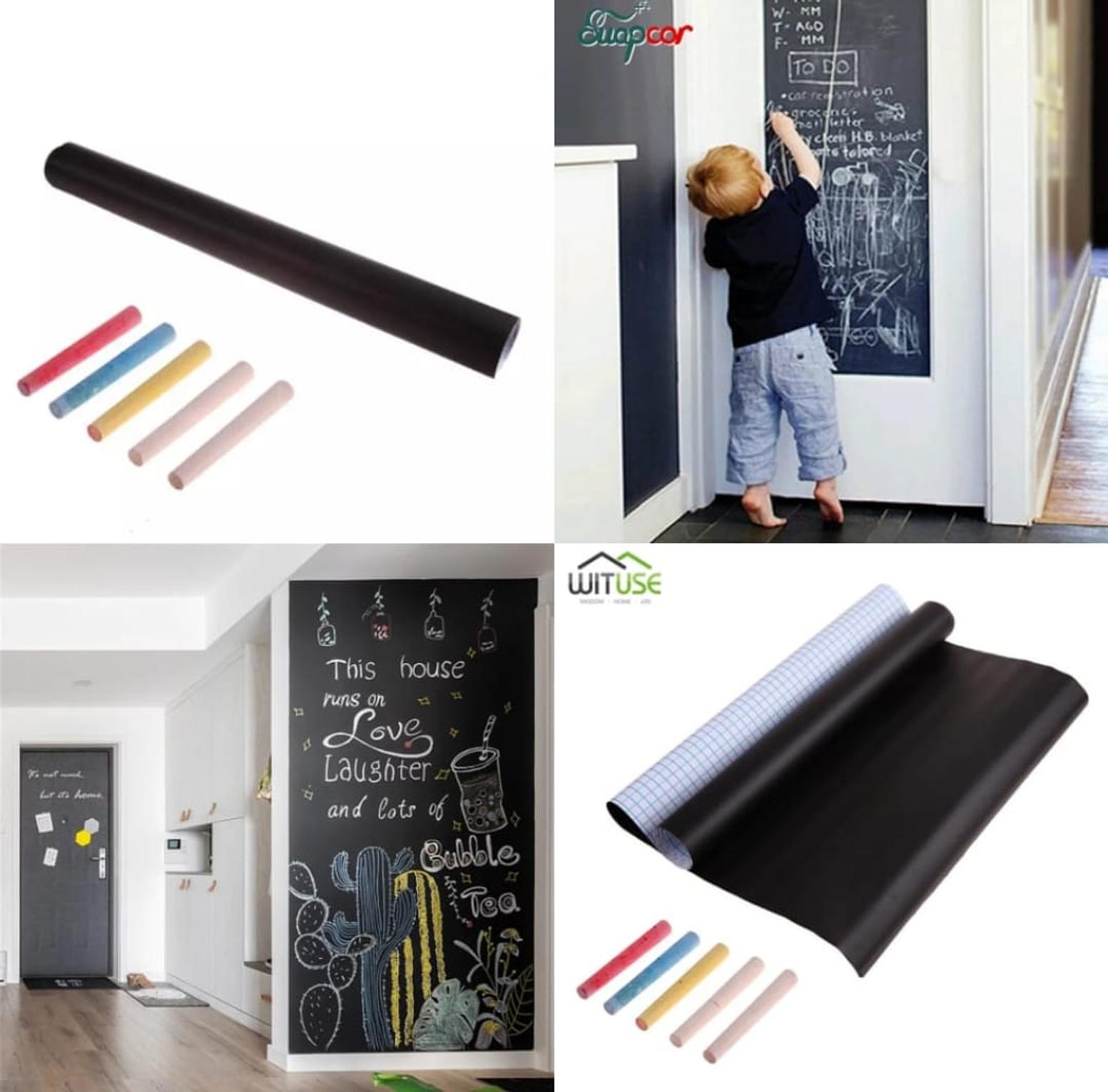 Chalkboard paper one roll contains 45 x 200cm of a strong vinyl material Frosted surface that can be used for chalk writing Gives you plenty of room for writing menus, sweet messages, to-do lists Interesting Diy Can be used as a kids room décor, child blackboard, tutoring supplies, kid wall art or home school materials! Even can be spice up your kitchen counter, furniture, notebook, dresser drawer, crafts, bedside table, bookcase, bookcase, door even wall. Suitable for smooth and flat surface. Can Be Used As a Kids Room Decor, Child Blackboard, Tutoring Supplies, Kid Wall Art or Home School Materials FREE CHALK: 5 FREE regular chalk sticks with your purchase so you can start your writing or drawing as soon as you receive your chalkboard sticks EASY TO USE: Remove the backing paper, then stick the black board decal on your surface. The high quality adhesive makes the chalk paper removable and repositionable without damaging the surface.(For Best Bonding, Hang It Like A Long Towel In The Air For 72+ Hours. Please Make Sure Paper Is Flat)
