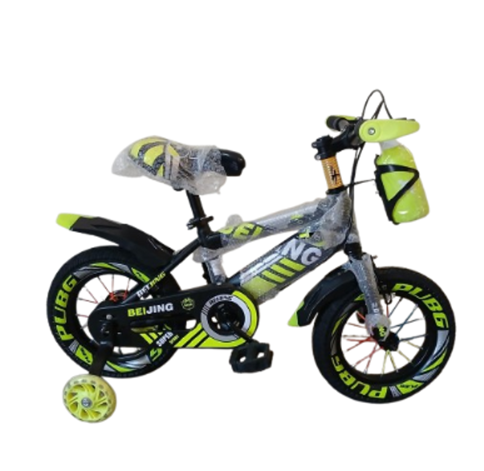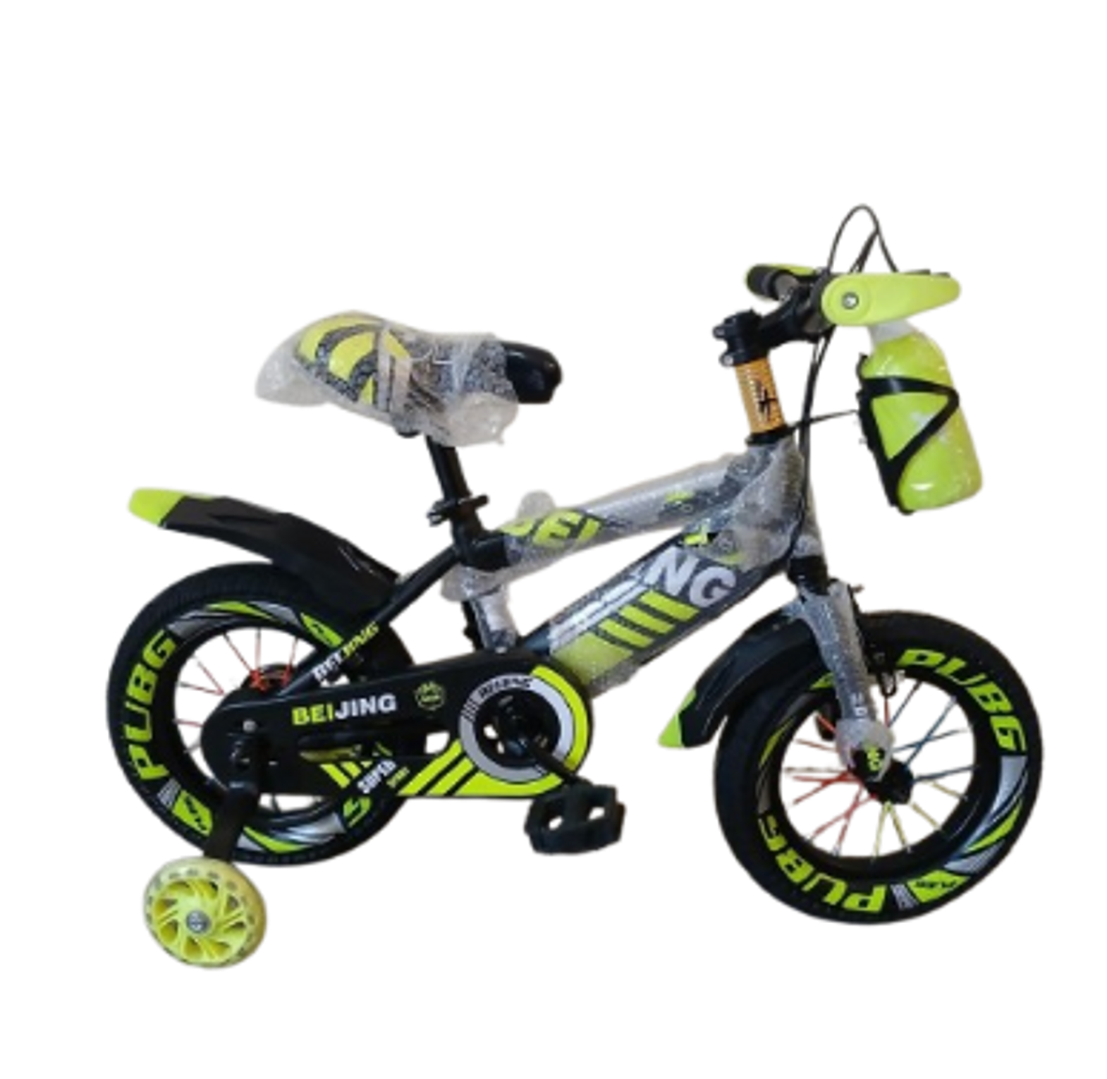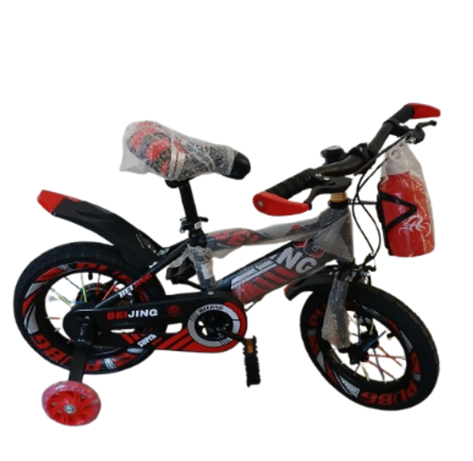 This bike features a bold red/blue/yellow/orange and black "PUBG" themed design that is highly popular with children. It is built with a sturdy high-carbon steel frame to withstand the typical bumps and falls of early learning. For safety, it includes a fully enclosed chain guard to prevent clothing or fingers from getting caught, along with heavy-duty removable training wheels for balance. The bike comes equipped with a water bottle and holder mounted on the front, providing convenience for young riders during outdoor play