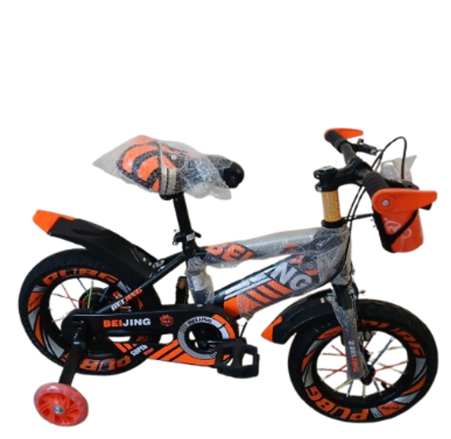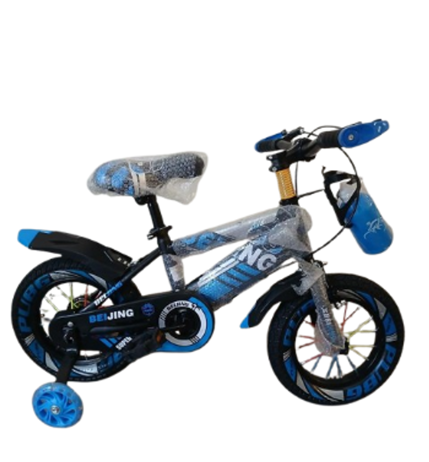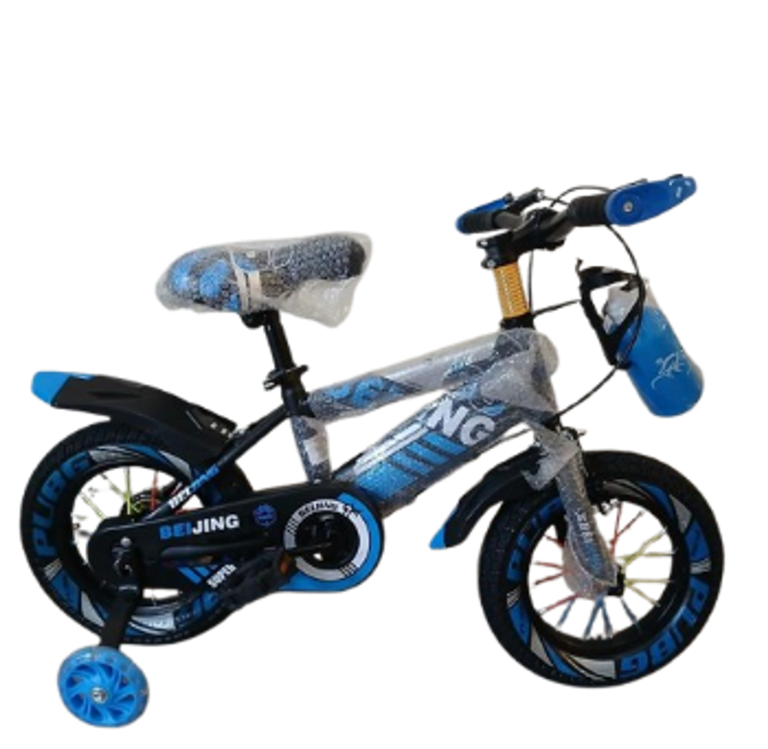 This bike features a bold red/blue/yellow/orange and black "PUBG" themed design that is highly popular with children. It is built with a sturdy high-carbon steel frame to withstand the typical bumps and falls of early learning. For safety, it includes a fully enclosed chain guard to prevent clothing or fingers from getting caught, along with heavy-duty removable training wheels for balance. The bike comes equipped with a water bottle and holder mounted on the front, providing convenience for young riders during outdoor play