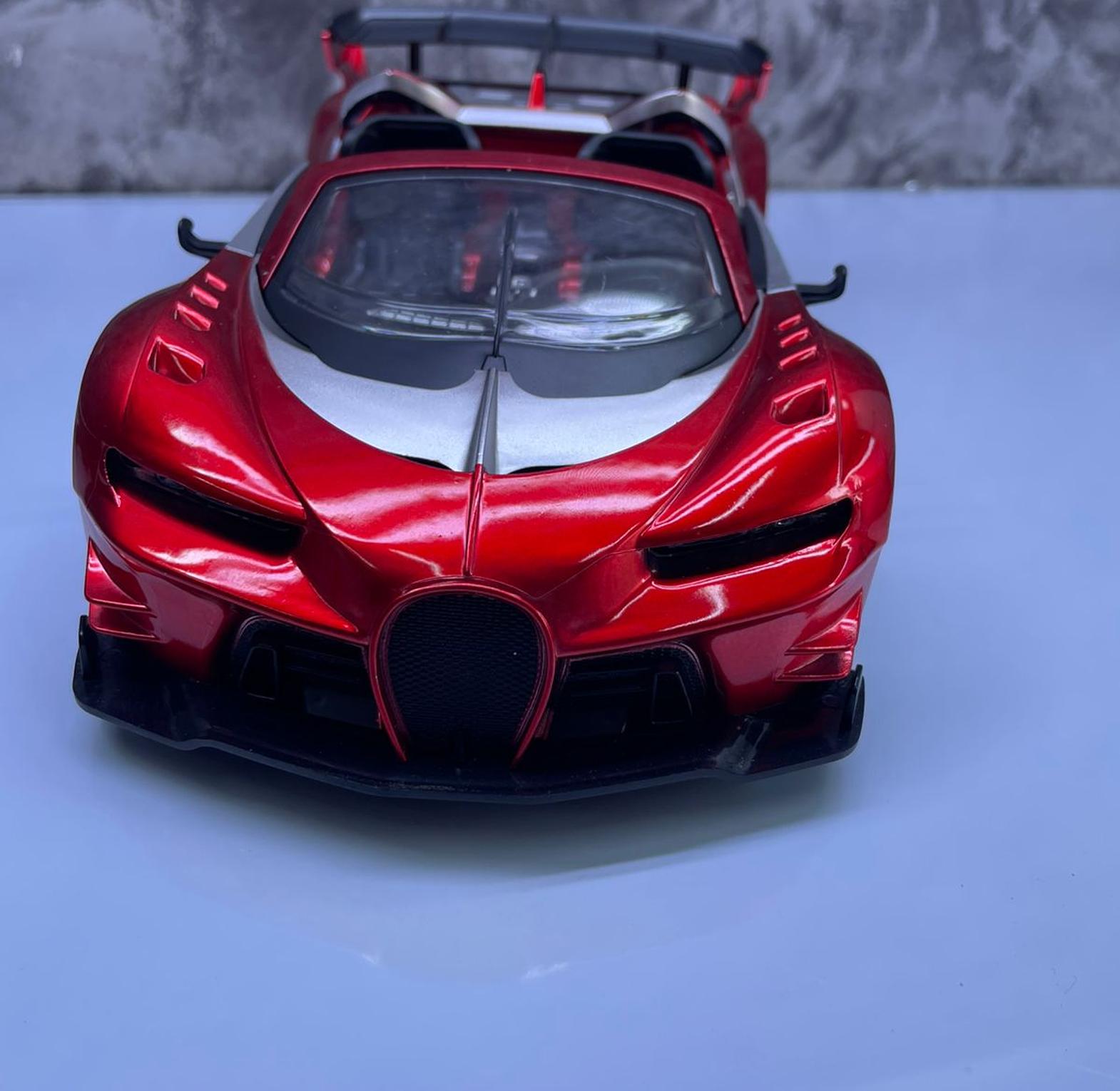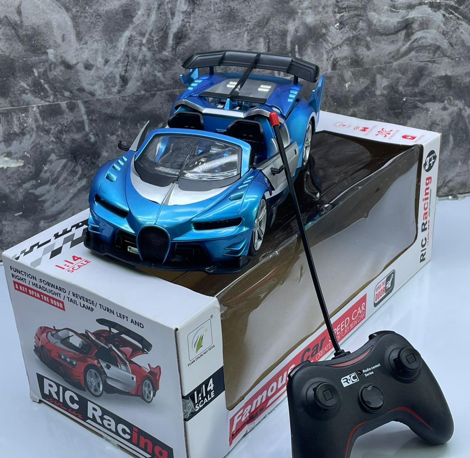 Brand: Bugatti Model Car. Resemblance to the luxury car brand. Type: It's a 1:14 scale model, operated via remote control. Features: It has functional doors, detailed interior, and often includes working lights. Power: battery-operated, rechargeable, with a remote controller. Material: Typically made of ABS plastic with a glossy paint finish. Control: Moves forward, backward, left, and right, controlled by a 2.4 GHz remote. Durability: Designed to withstand collisions, suitable for indoor and outdoor