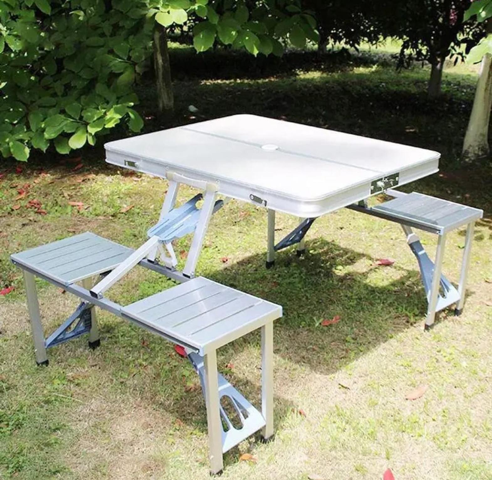 This product is a lightweight, all-in-one table and seating solution designed for outdoor use such as camping, picnics, and tailgating. It is constructed primarily from aluminum, making it durable yet easy to transport. The table and the four attached seats can fold compactly into a suitcase-style case with a handle for effortless storage and carrying.