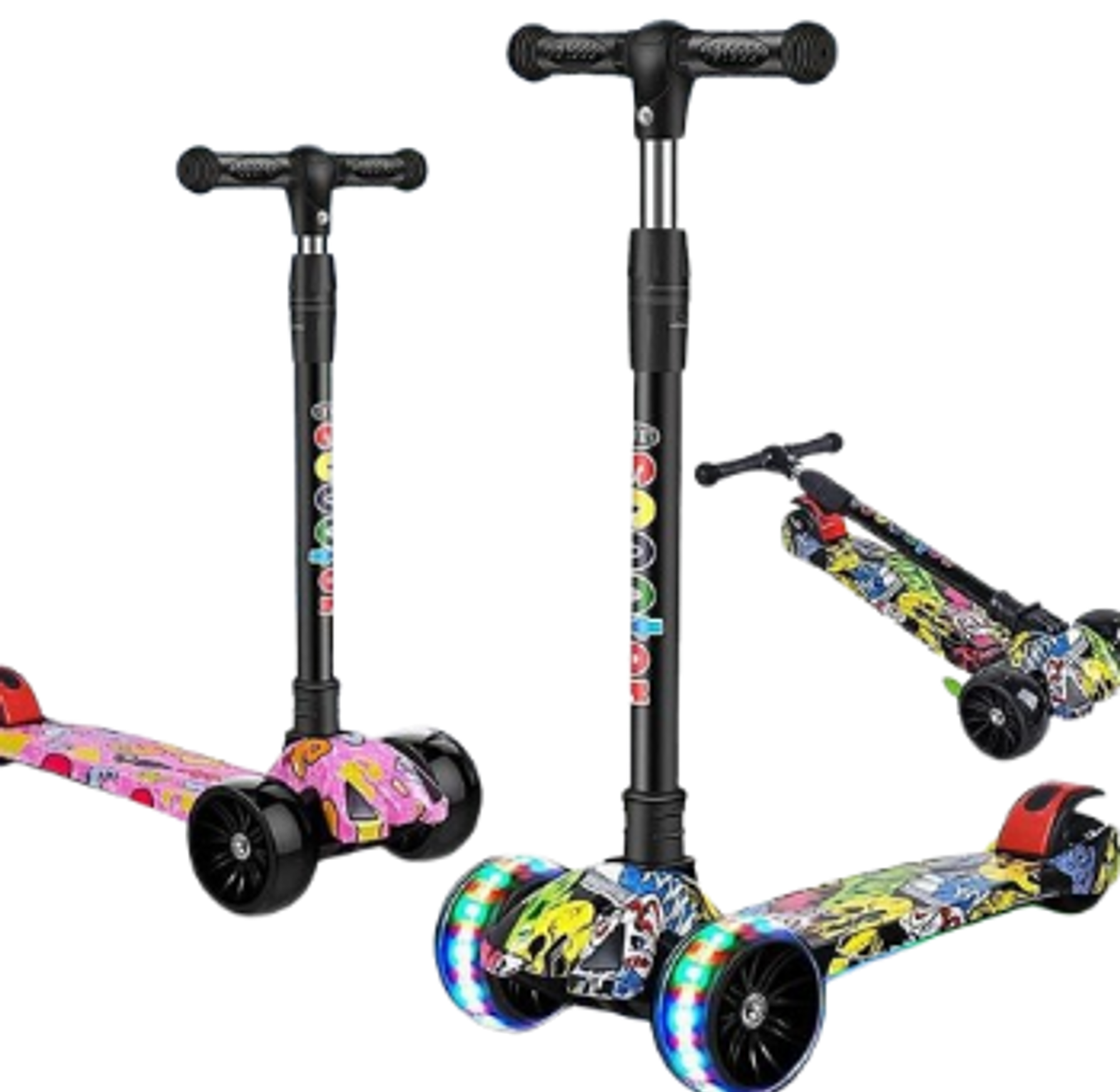 Graffiti Kick Scooter or Smart 3-Wheel Scooter. It is designed for beginners to help them develop balance and coordination through its stable triangular design. The scooter features a vibrant, colorful graffiti-style pattern on its non-slip deck and handlebar stem. It is equipped with kinetic LED light-up wheels that illuminate automatically as the child rides, requiring no batteries. The "lean-to-steer" technology allows children to turn by simply shifting their body weight, making it intuitive for young riders who are not yet ready for a traditional two-wheel scooter. Many models also include built-in music or melody features for added entertainment.