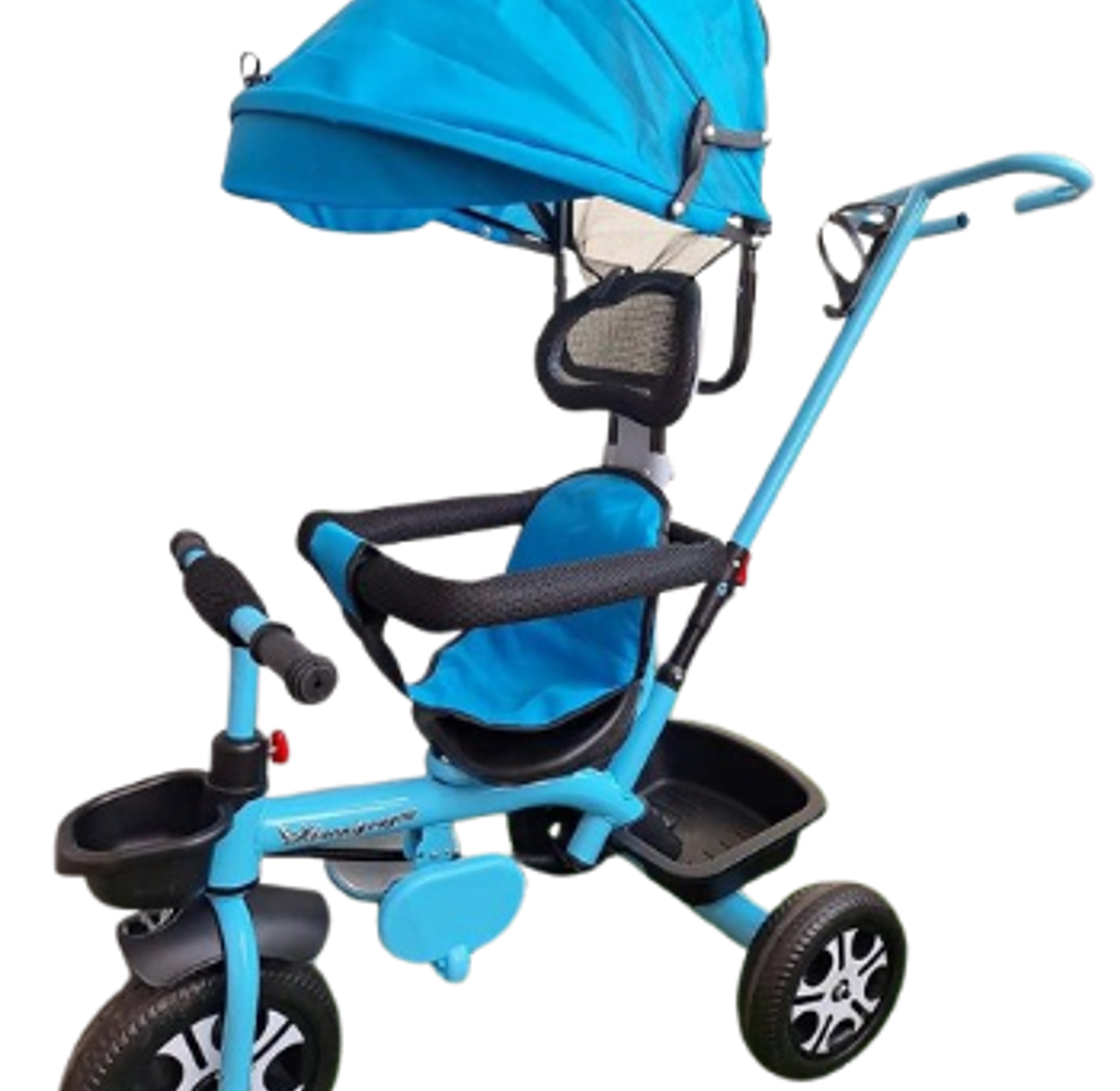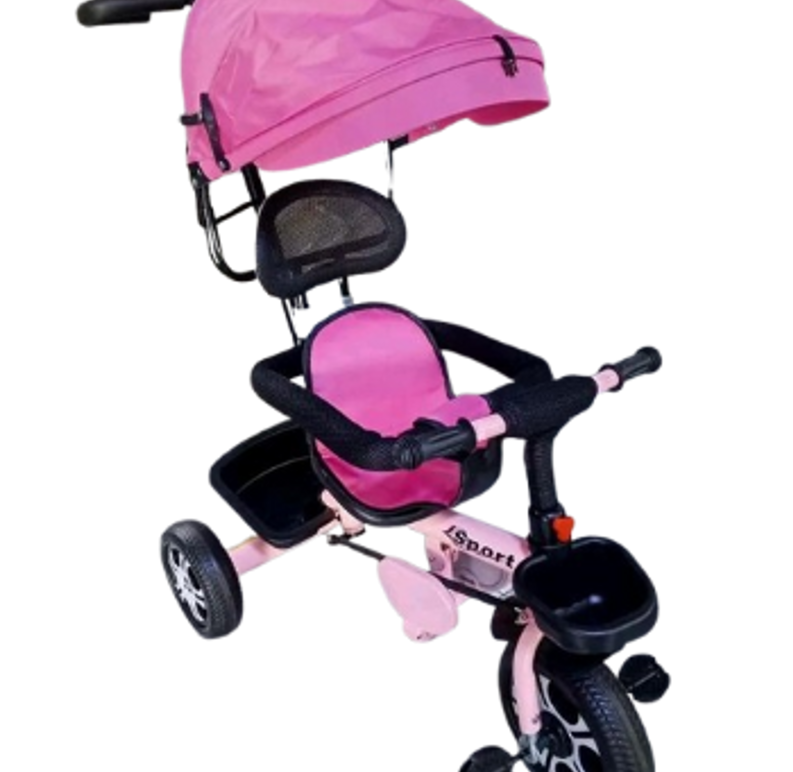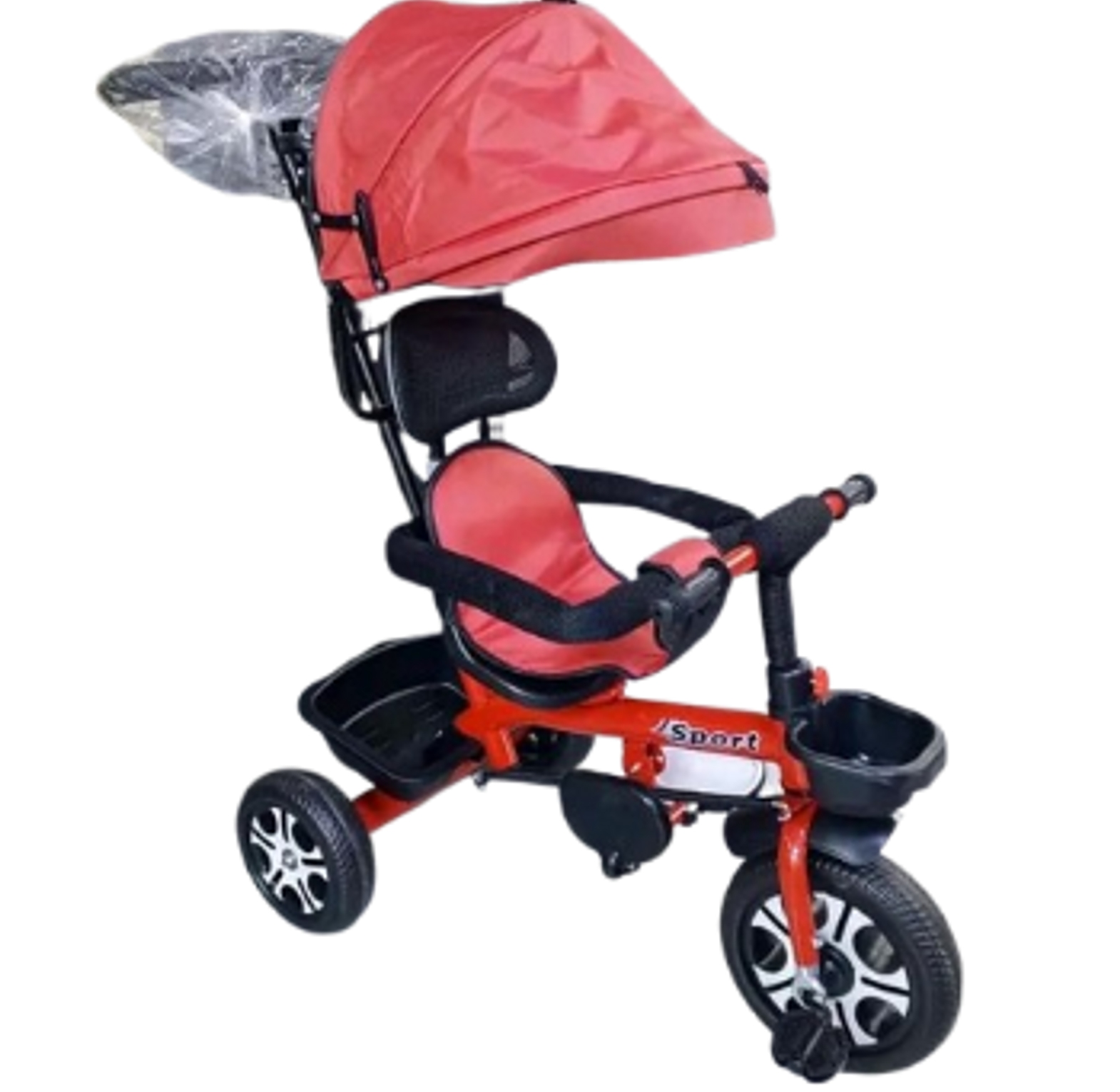 This versatile vehicle functions as both a parent-controlled stroller and an independent tricycle. It features a modular design where components like the UV-protective canopy, safety guardrail, and parental push handle can be removed as the child grows more confident in riding. The "Sport" model is characterized by its bold red high-carbon steel frame, a 360-degree rotatable seat for face-to-face interaction, and shock-absorbing wheels suitable for various terrains like asphalt or wood floors