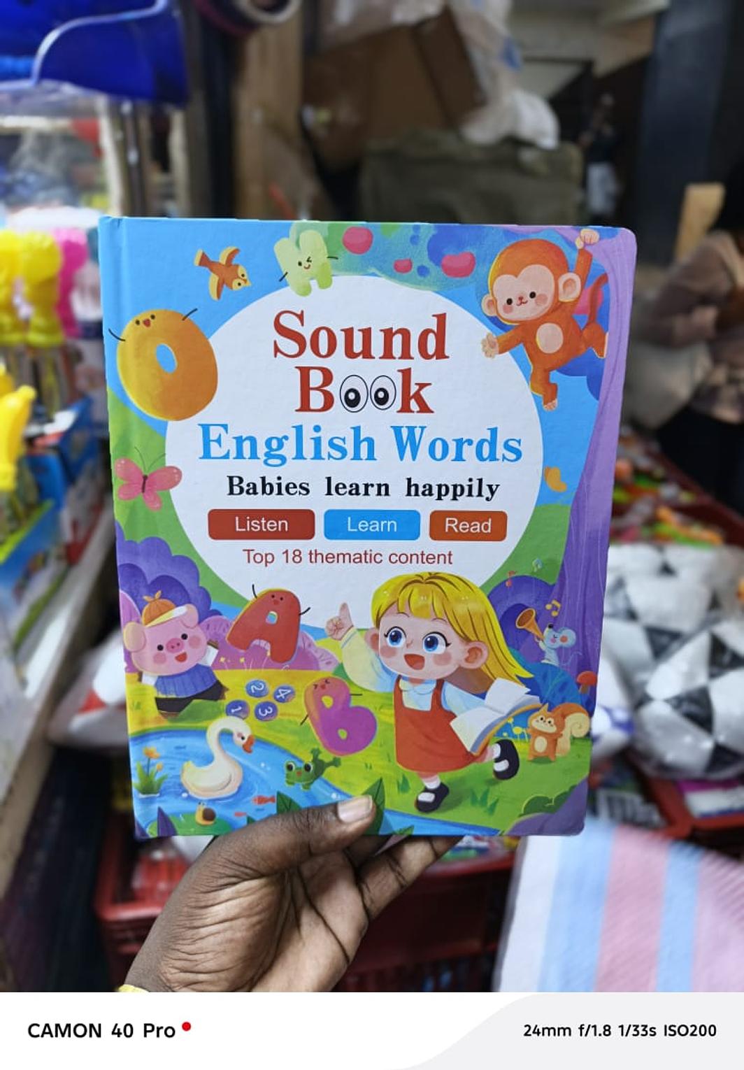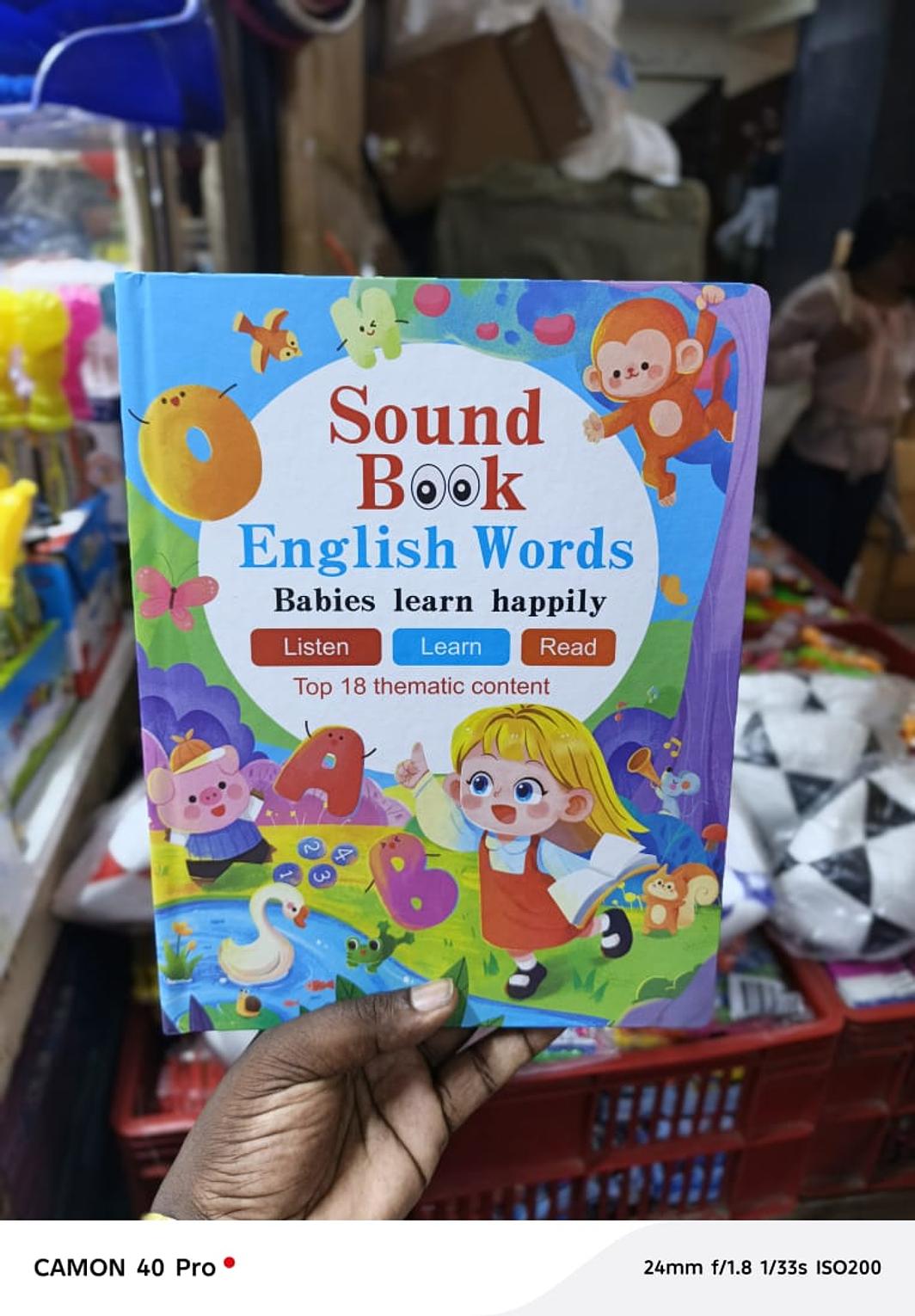 This is an interactive learning book designed for babies to learn English words happily. It features "Top 18 thematic content" and encourages learning through listening, learning, and reading.