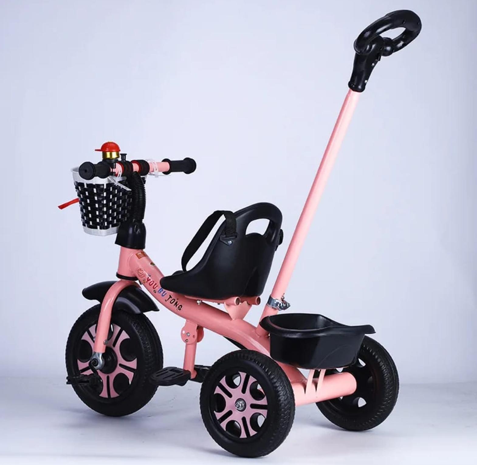 2-in-1 Design: Can be used as a parent-controlled stroller trike or as a self-pedaled ride-on once the child is older. Parental Control: A tall, adjustable push handle allows parents to guide the tricycle from behind. Comfort & Safety: Features a comfortable black seat with a backrest and, in some models, a safety belt for added security. Interactive Elements: Includes a thick handlebar with a bell for play. Developmental Benefits: Helps children develop motor skills, coordination, balance, and spatial awareness.