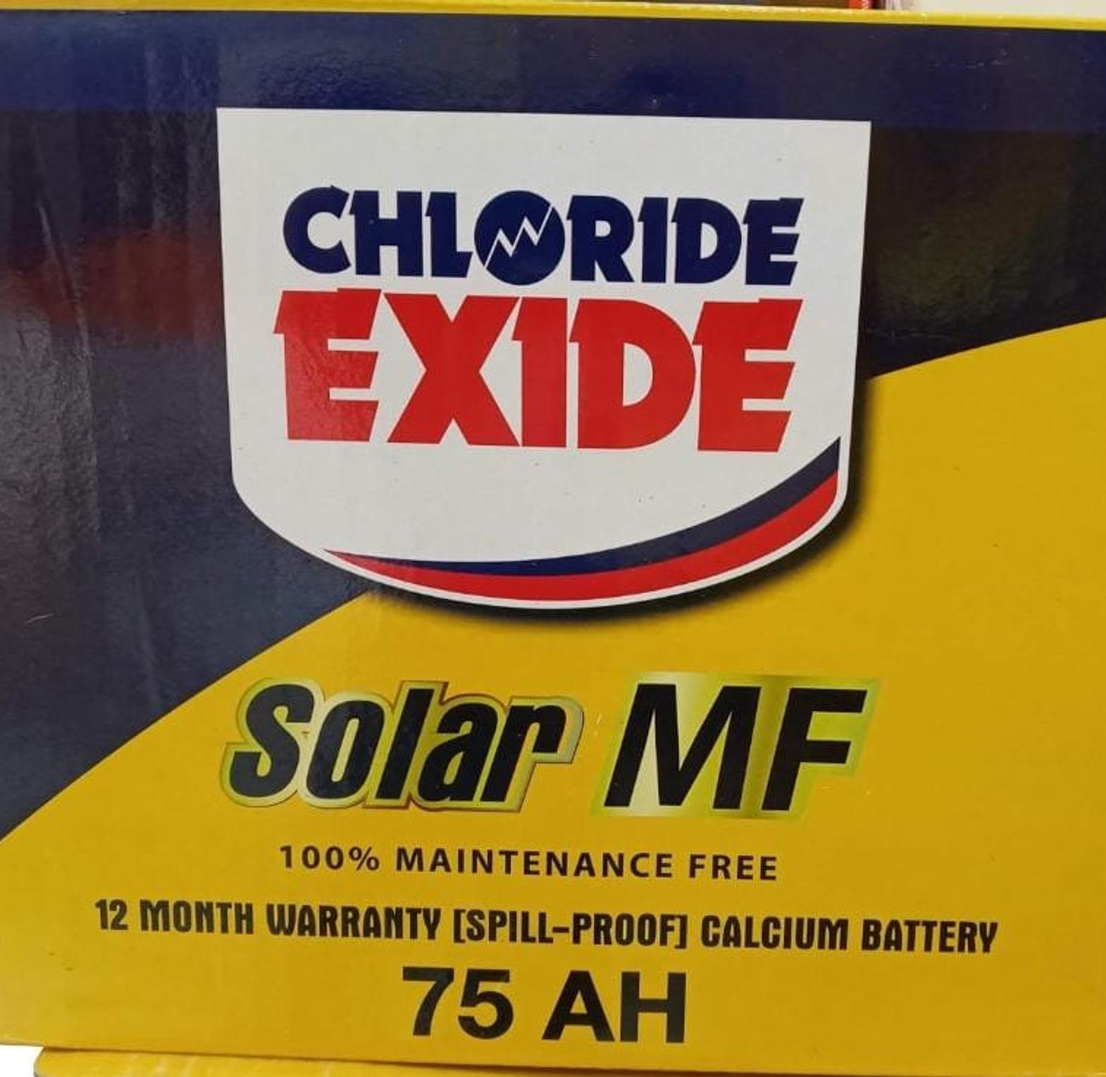 Name: Chloride Exide Solar MF Battery. Capacity: 75 AH (Ampere-hours). Type: 100% Maintenance-Free (MF). Technology: Calcium Battery. Warranty: 12 Month Warranty. Feature: Spill-Proof. Application: Designed for solar energy storage applications, including off-grid solar systems and backup power solutions. Performance: Known for reliable performance and long life.