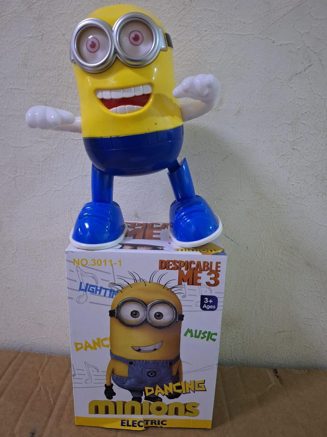 Dancing Movements: The minion toy wiggles and moves, often with rotating arms and eyes, creating a dynamic play experience. Lights and Music: It features flashing lights and plays catchy music or sound effects to stimulate visual and auditory senses. Character Design: The toy captures the appearance of a Minion from the Despicable Me franchise, with its iconic yellow body, goggle design, and blue overalls. Specifications: Material: Made from durable, non-toxic plastic. Power Source: Typically battery-operated, often requiring AA batteries (not included). Age Recommendation: Generally recommended for children aged 1+ or 3+ years, depending on the specific model. Features: May include an easy on/off switch, light-up eyes, and musical capabilities.
