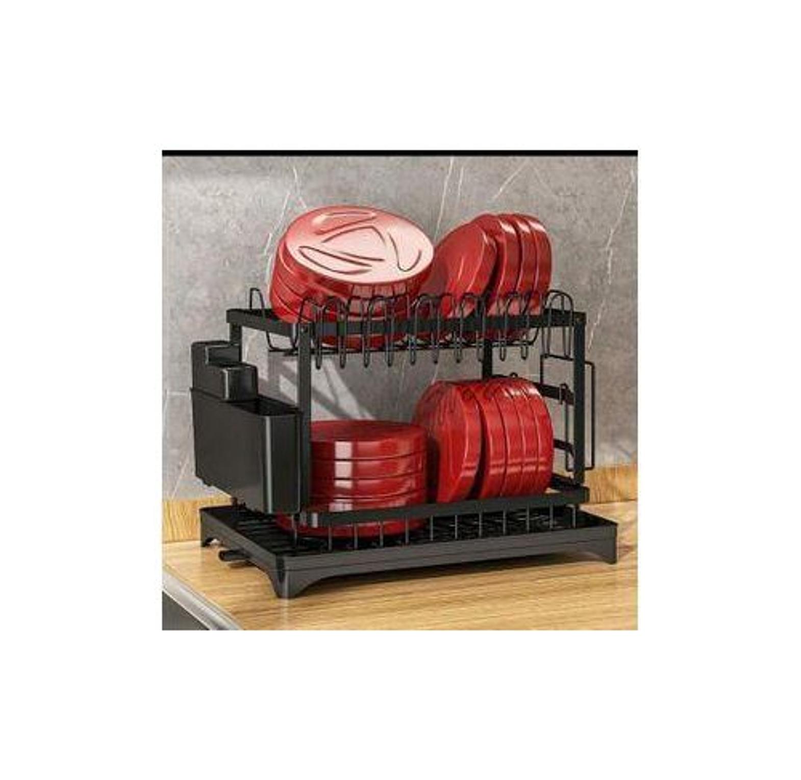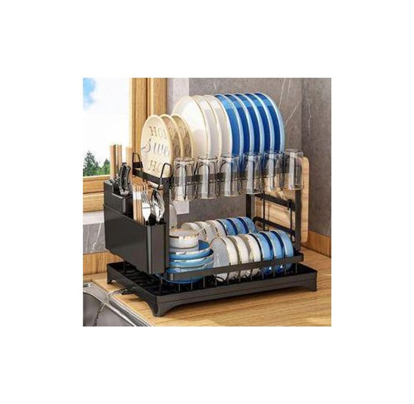 Organize your kitchen in style with this Advanced Black Dishrack, designed for maximum space-saving and efficient dish drying. Featuring a 2-tier design, it offers ample space for plates, bowls, cups, and utensils, while maintaining a compact footprint on your countertop. Made from rust-resistant coated steel with a sleek black finish, this dishrack is not only durable but also blends beautifully with modern kitchen décor. It includes a detachable cutlery holder, cup hooks, and a removable drip tray to keep your kitchen clean and dry.