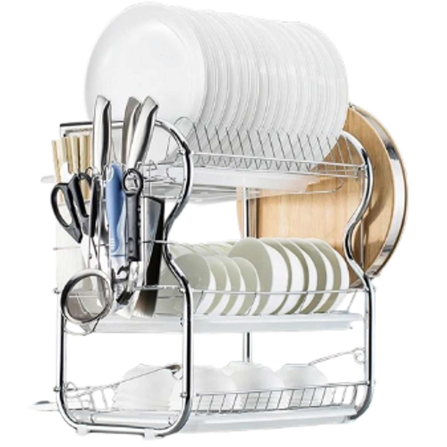 This 3 Tier Stainless Steel Dish Rack is the best option for household kitchen. It accommodates dishes and removable glassware rack and tray for drainage system. It is designed with durability and functionality at the same time fitting the style of every kitchen. Large, practical desiccator for plates, glasses and utensils. There are three drying levels and removable plastic trays that collect excess water. The cups and utensils are separate and can be removed. Allows ideal organization of the dishes and utensils. Necessary and useful accessory for each household. The chrome plated steel construction makes it stable and low-maintenance. It is designed with flexibility- enough to handle large household items and even party dishes.