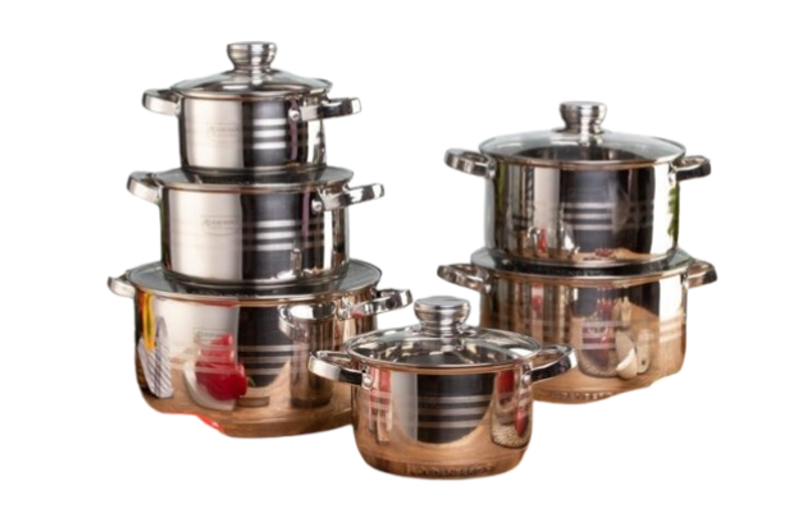 The Edenberg EB-4036 is a comprehensive 12-piece cookware set designed to meet a variety of cooking needs. Crafted from high-quality stainless steel, this set promises durability, even heat distribution, and a sleek, professional look for your kitchen. The set includes an assortment of saucepans, stockpots, and a frying pan, all equipped with sturdy, riveted handles for a secure grip. The pots come with tight-fitting lids, many of which are made of tempered glass, allowing you to monitor your cooking without losing heat or moisture. The stainless steel construction is not only robust but also ensures compatibility with all stovetops, including induction. This cookware is designed for ease of use and cleaning, making it a practical choice for both novice and experienced cooks. The polished finish adds an elegant touch to your kitchen decor, while the variety of sizes caters to different cooking tasks, from simmering sauces to boiling pasta