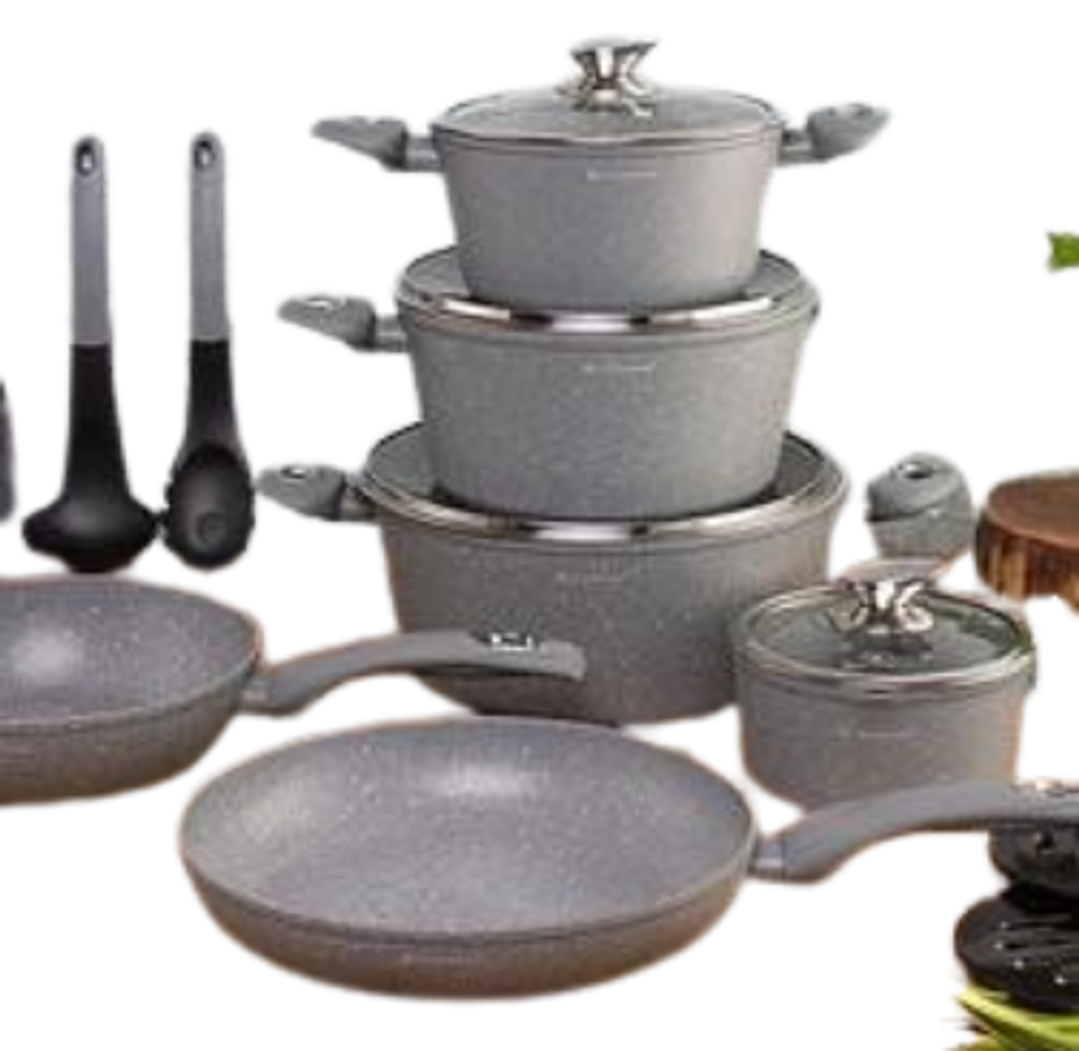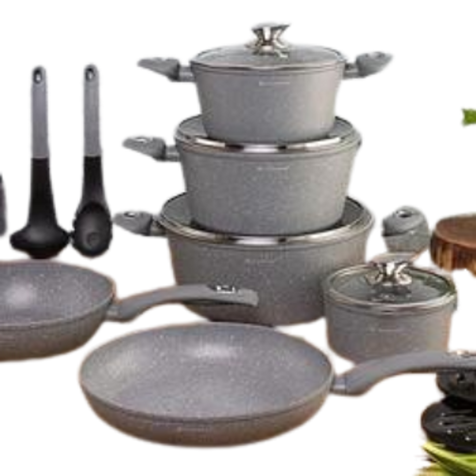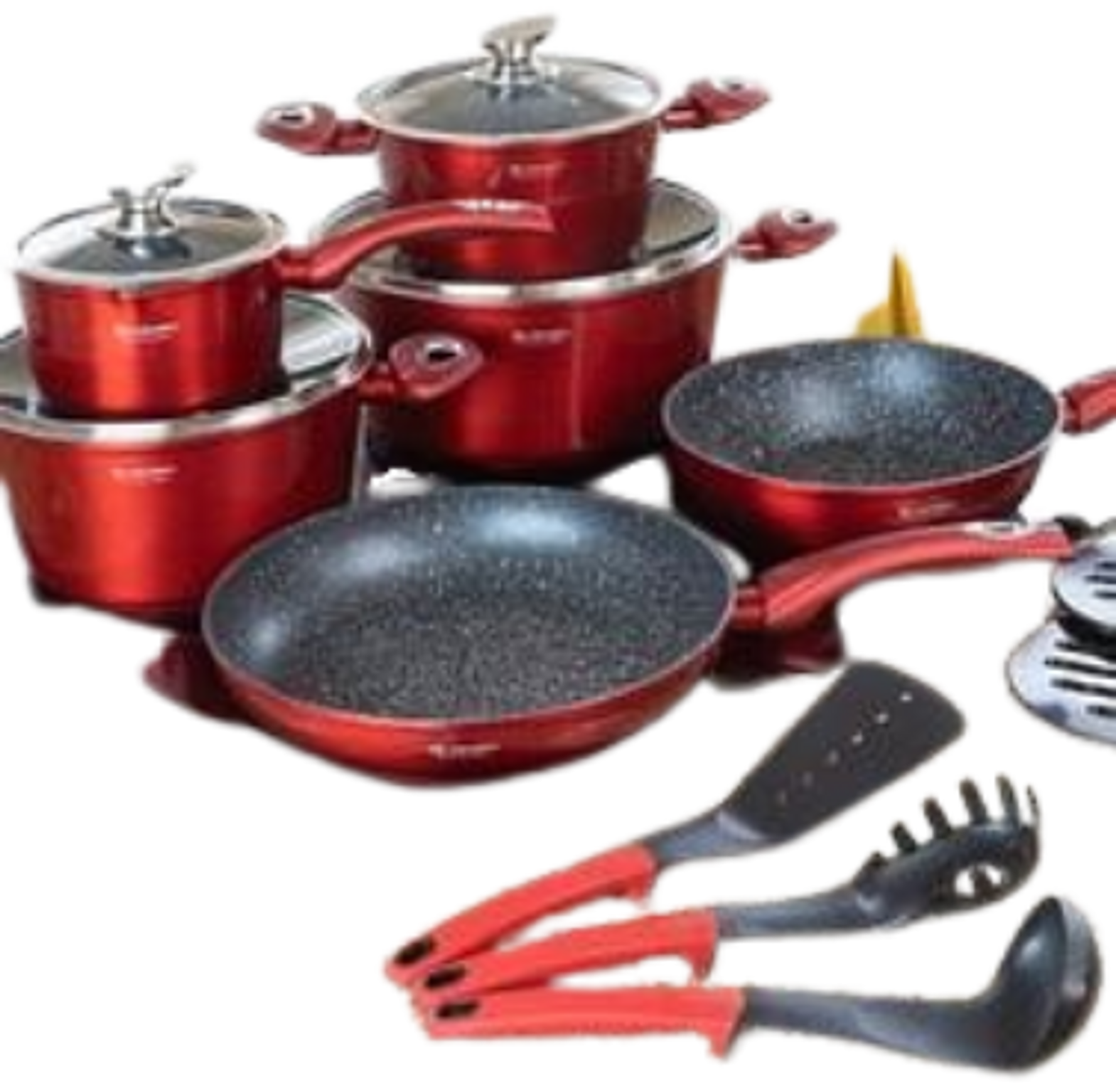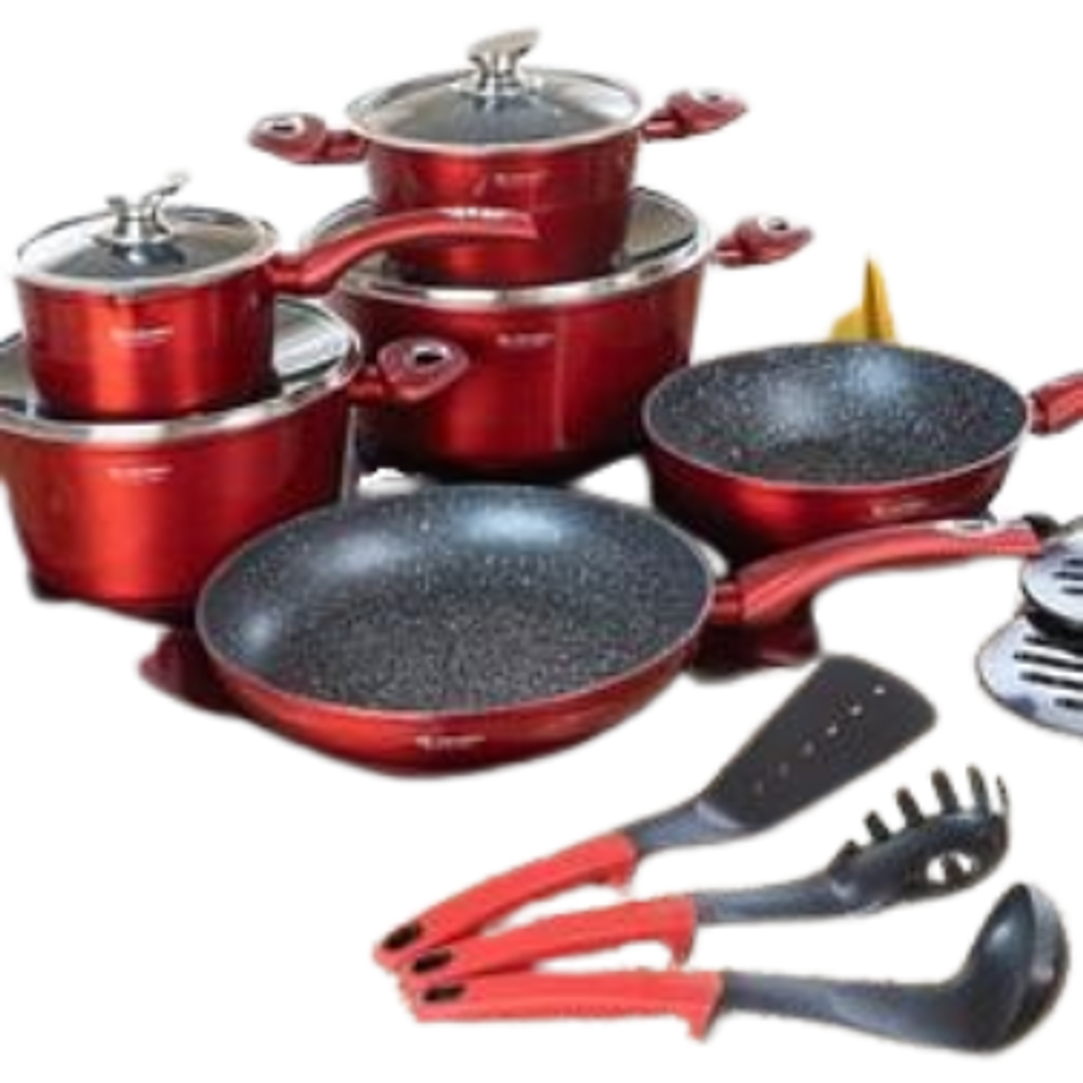 The EB-5620 set features a high-grade three-layer granite coating that is extremely hard, scratch-resistant, and PFOA-free. This advanced surface allows for healthy cooking with minimal oil and ensures easy food release. Each piece is constructed from pressed aluminum, providing rapid and even heat distribution. The set is aesthetically pleasing with its grey/RED "stone" finish and includes matching kitchen utensils and heat-resistant coasters, making it a comprehensive solution for a modern kitchen.