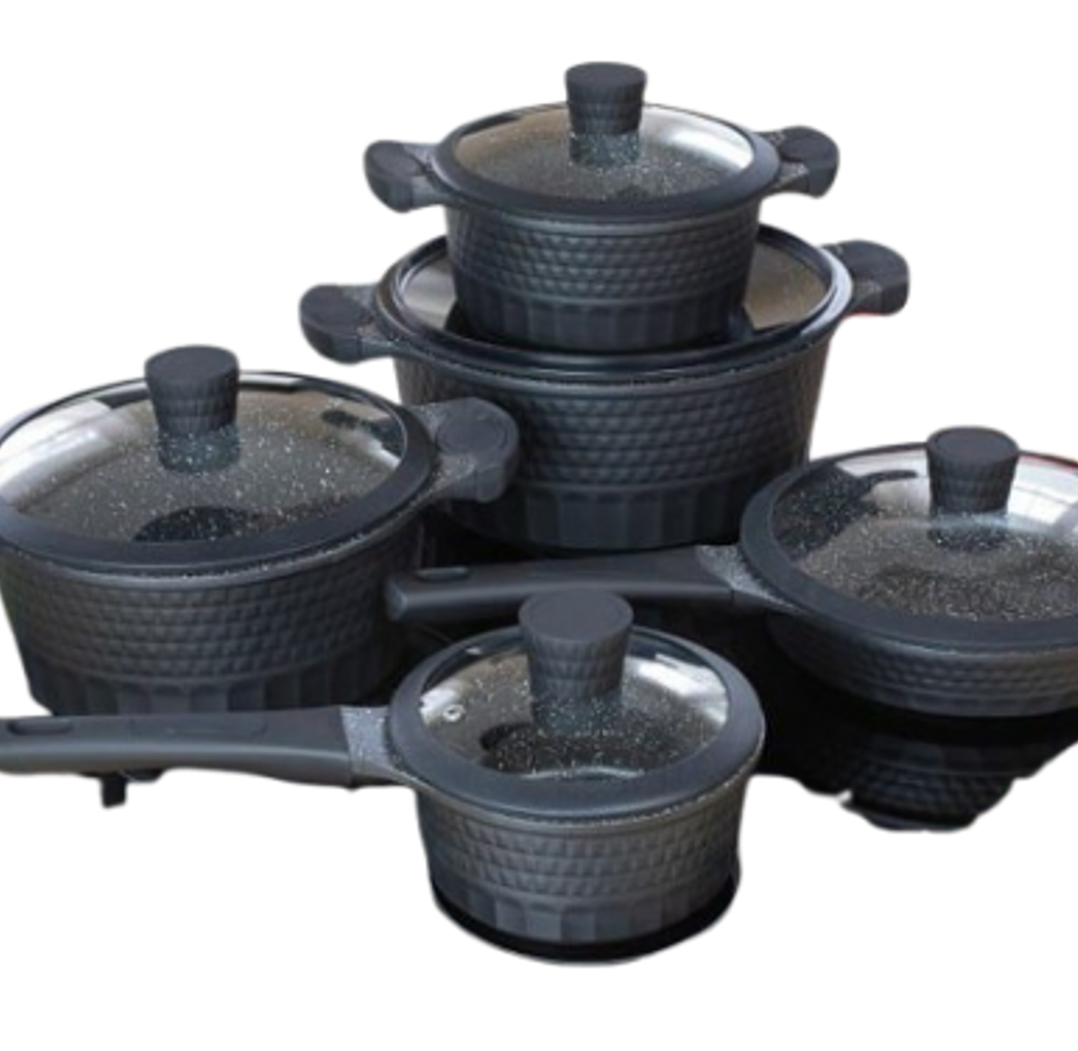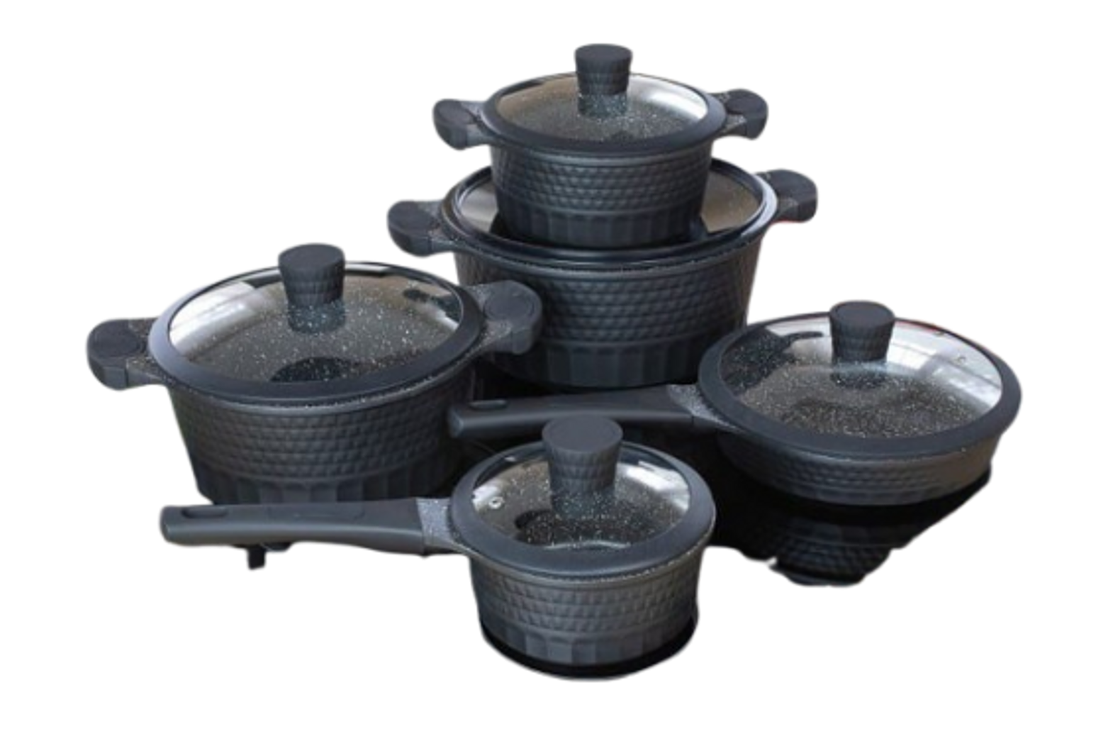 The EB-9186 set is designed with a high-performance 3-layer marble non-stick coating, which allows for healthy cooking with minimal oils or fats. Each piece is crafted from durable forged or pressed aluminum, providing excellent heat conductivity and a lightweight feel. The set's signature textured exterior is scratch-resistant, while the "Turbo Induction" bottom ensures rapid heating and energy efficiency. HIGHLY RECOMMENDED