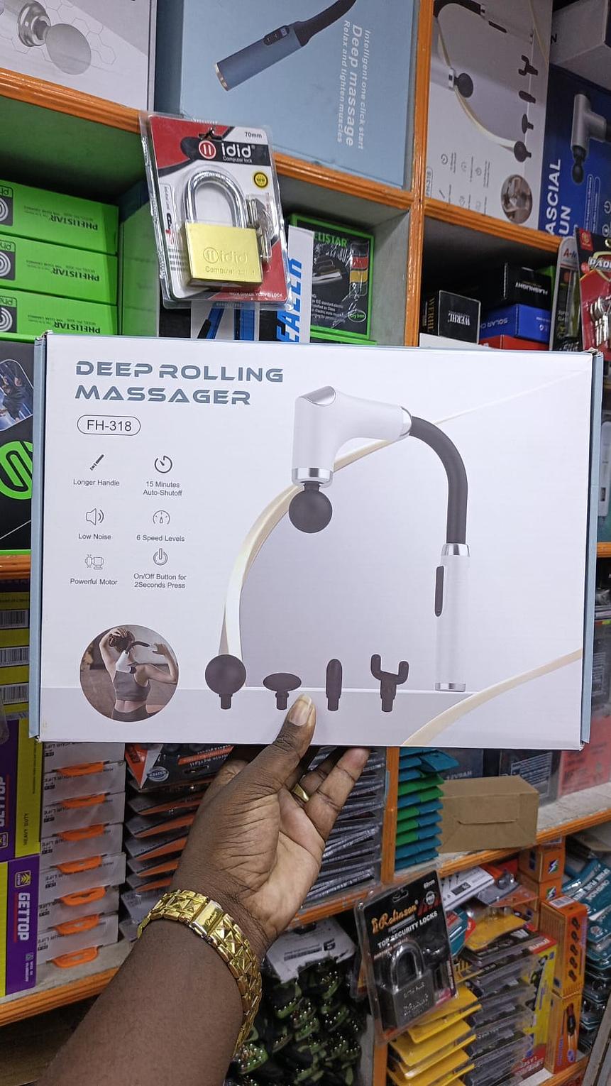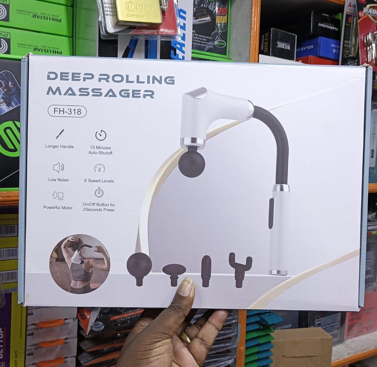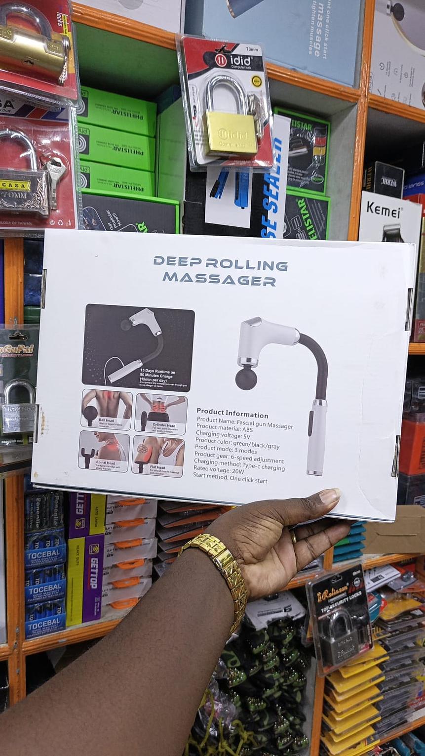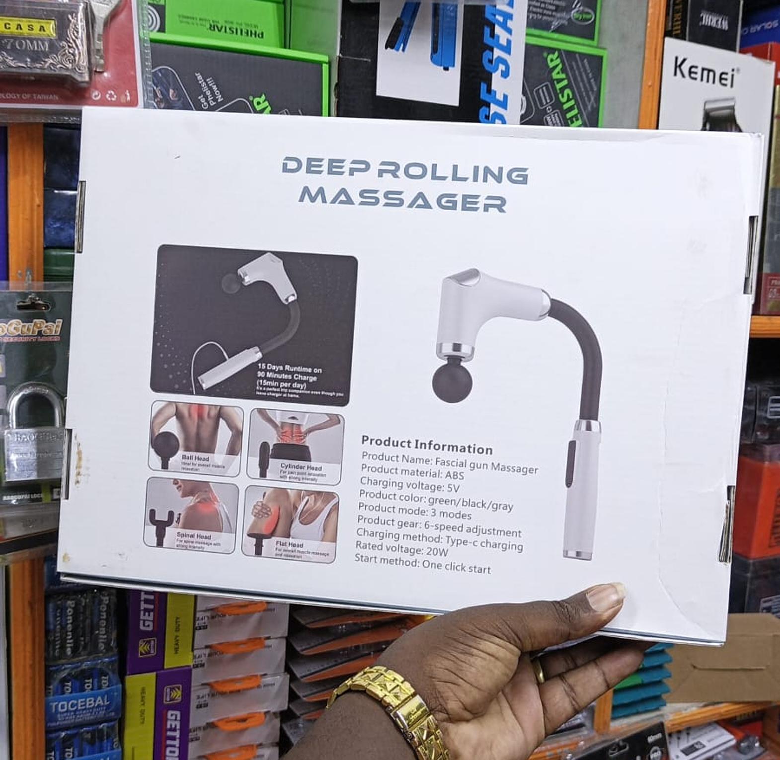 This device is a portable, handheld electric massager designed for deep tissue muscle relief and recovery. It helps to alleviate muscle stiffness, soreness, and pain, and can improve overall muscle health and circulation. The design is ergonomic with a long handle for easy reach to various body parts.