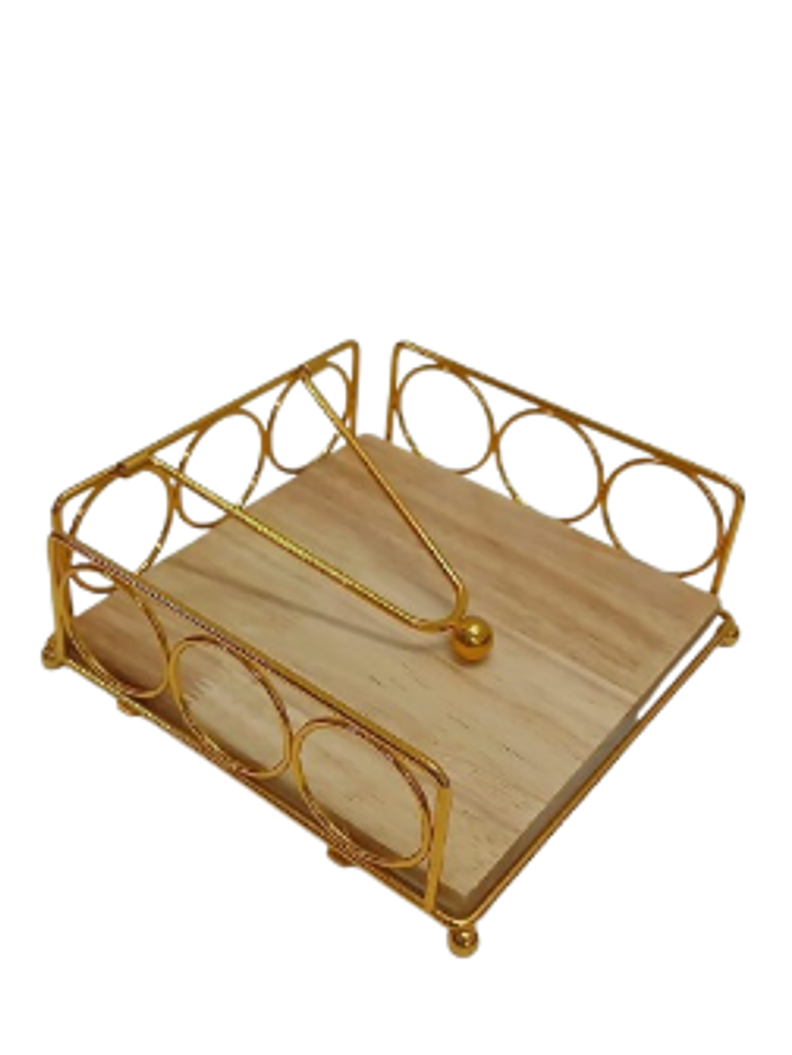This is an elegant and modern napkin holder designed for holding cloth or paper napkins. It features a gold-colored metal frame with a distinctive circular pattern along the edges and a solid wooden base. A weighted arm, also gold-colored, pivots to secure the napkins in place.