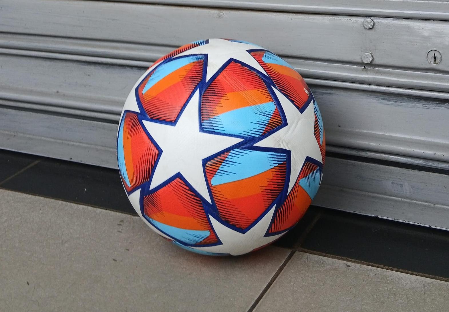 The soccer ball is the Adidas UCL Finale 20 Pro Official Match Ball. It was the official match ball for the UEFA Champions League during the 2020-21 season. The ball's design features a dynamic look with star panels in white, royal blue, and signal coral, which are framed in blue to create the illusion of movement when the ball is in flight.