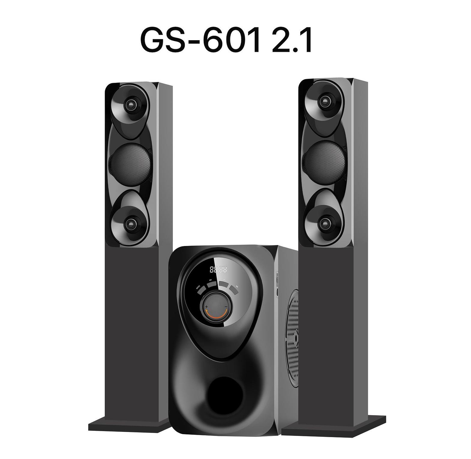 he Globalstar GS-601 is a 2.1-channel multimedia home theater system designed to elevate home entertainment with immersive sound. It combines a powerful subwoofer with two tallboy satellite speakers, featuring X-Bass technology for deep, punchy bass and clear highs, making it suitable for music, movies, and gaming. The system has a modern design with a wooden and plastic build.