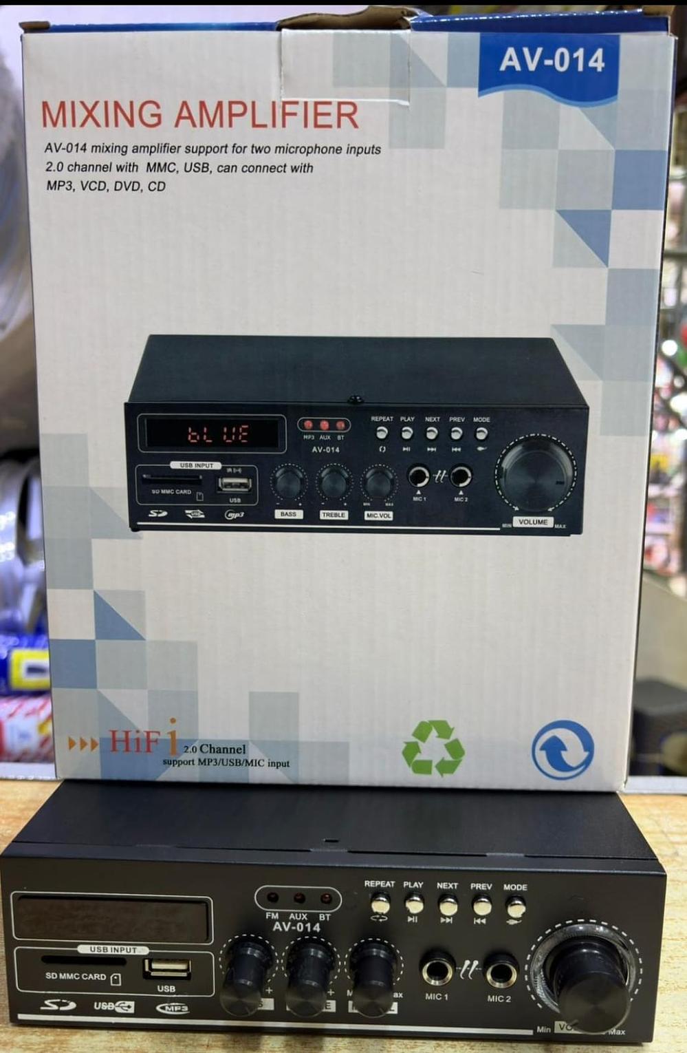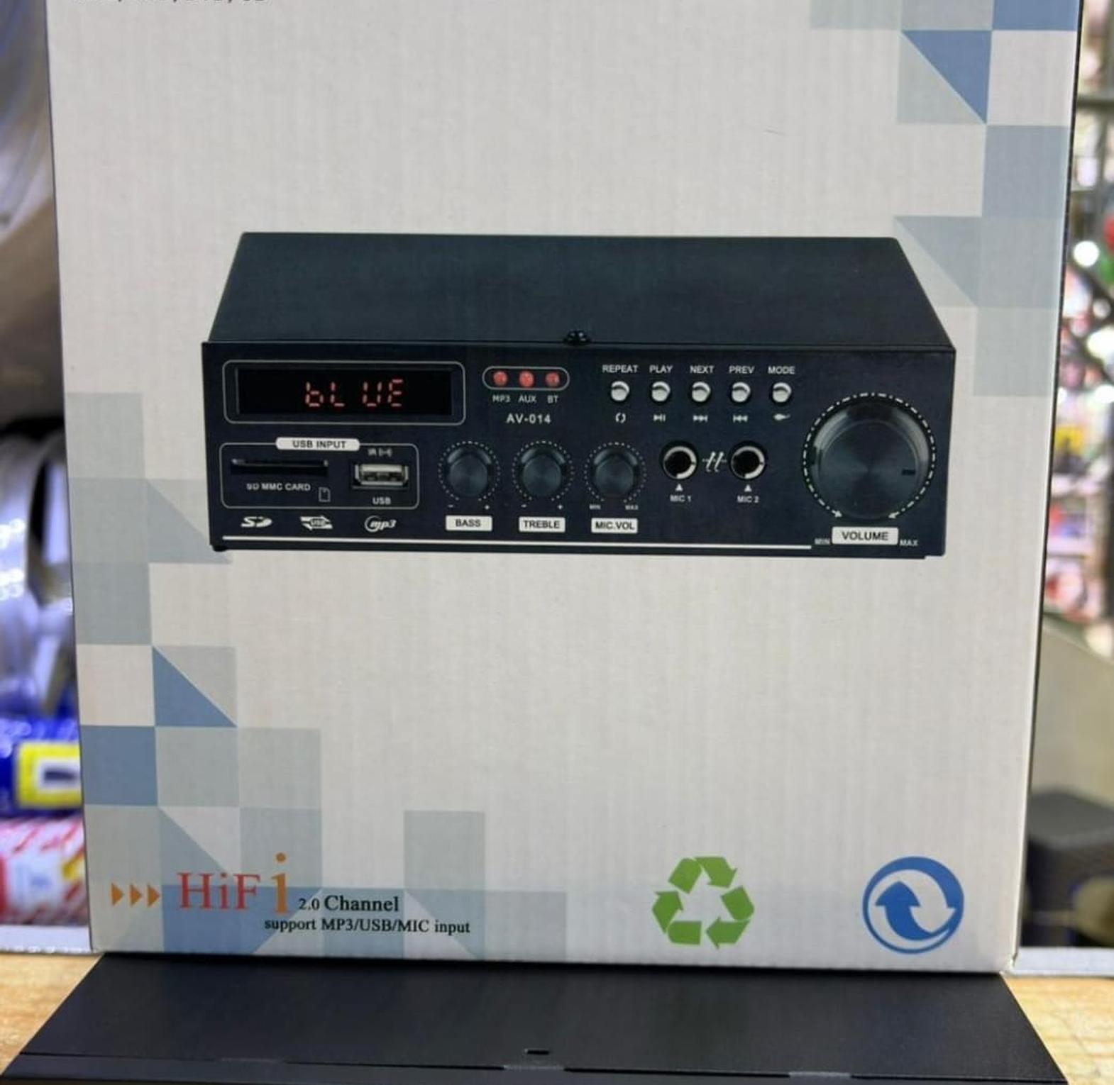 This mixing amplifier supports two microphone inputs and 2.0 channel stereo sound. It features built-in Bluetooth connectivity, FM radio, and a media player that can connect with various devices.