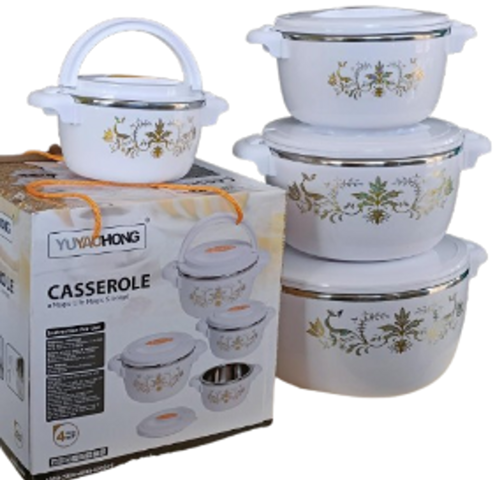 Have your self these elegant and classic large 4 pieces hot pots at home. This casseroles are odorless, durable, and virtually unbreakable. These hot pots have a fusion of stainless steel and plastic , they come with a high grade stainless steel interior which makes it easy to clean. They also keep your food hot or warm from 4 to 6 hours a day. The patented locking lid of these pots keeps food fresh and spill proof - great for transporting food to parties, picnics, and potlucks.