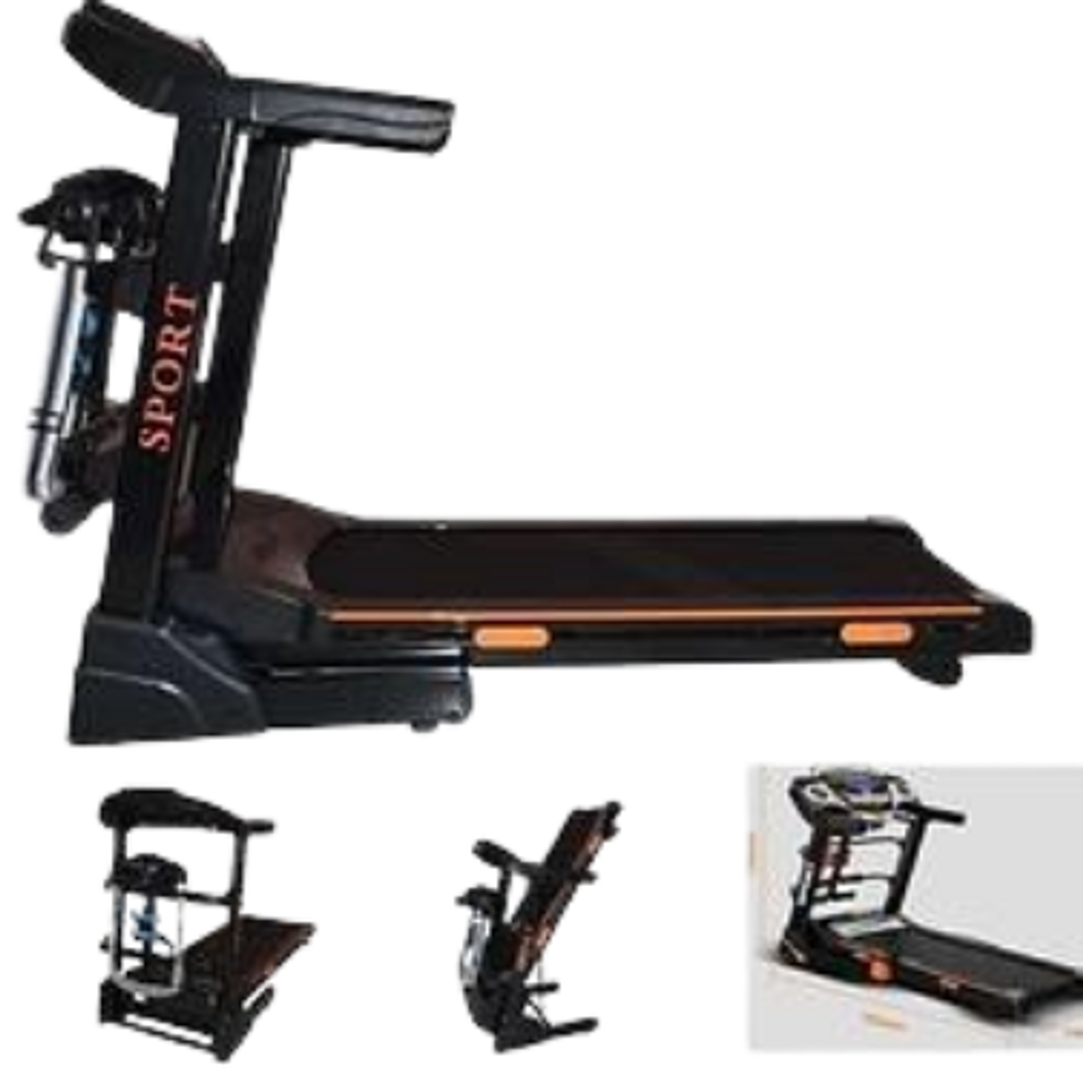 The HRS T400MS is a versatile electric treadmill that integrates cardio, strength, and recovery functions into one unit. It is built with a sturdy high-quality steel frame and an improved shock absorption system to minimize impact on joints and provide a comfortable running experience. Beyond running, it serves as a complete home gym by including a built-in belt massager for post-workout muscle recovery, as well as free dumbbells (typically a 1kg pair) and a tummy trimmer for supplemental strength and toning exercises. Its foldable design and built-in wheels make it easy to store and move within a home or fitness studio