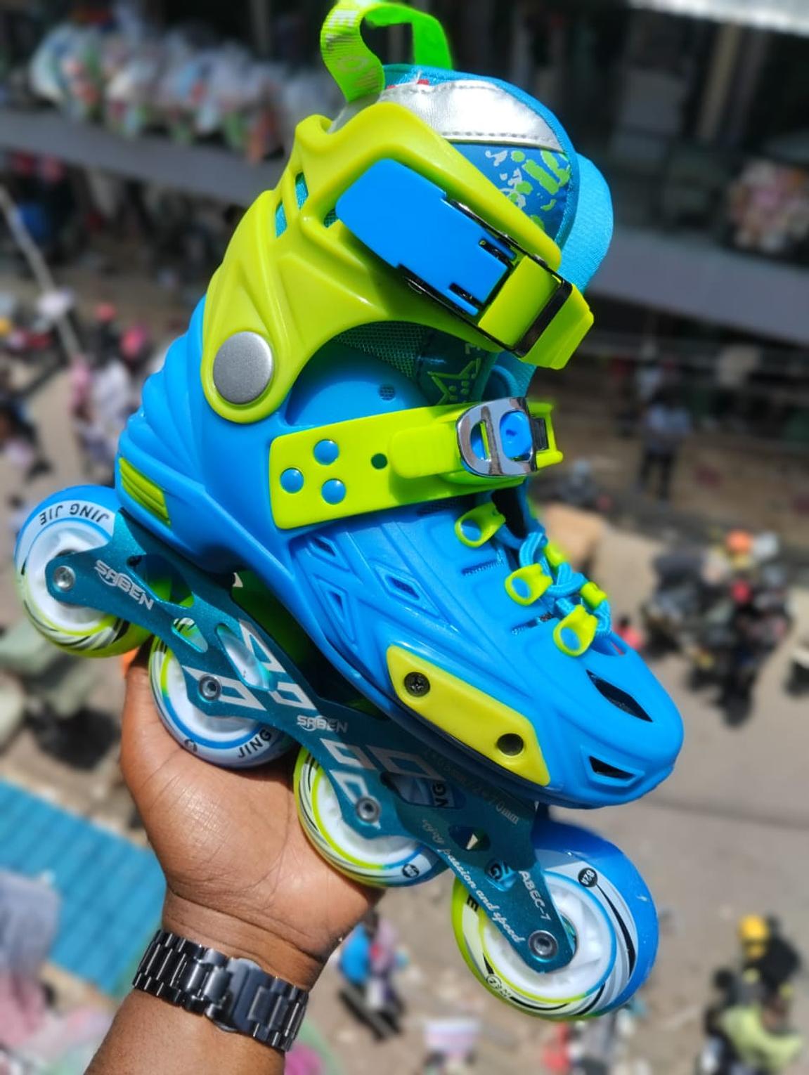 Brand and Model: Saiben Jing Jie Inline Skate. Design: Features a vibrant blue and neon yellow color scheme, with a hard boot construction and adjustable straps for a secure fit.
