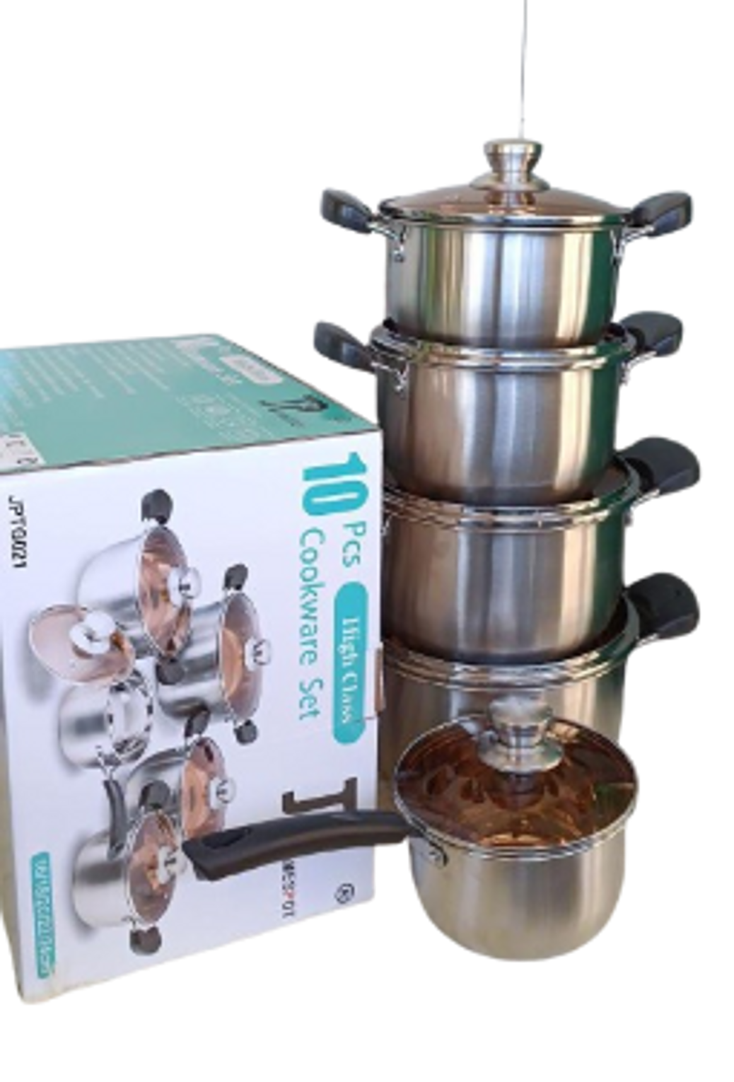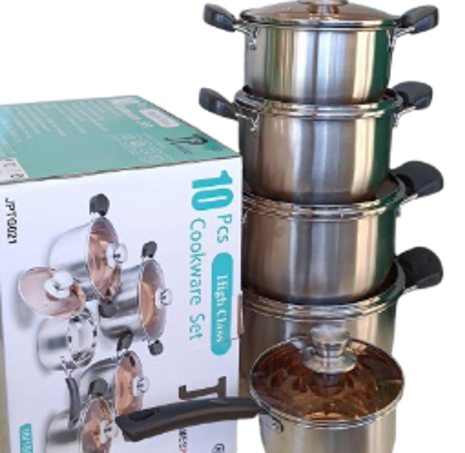 Jamespot High Class 10-Piece Stainless Steel Cookware Set (Model JPTG021), a comprehensive kitchen collection designed for durability and versatile home cooking