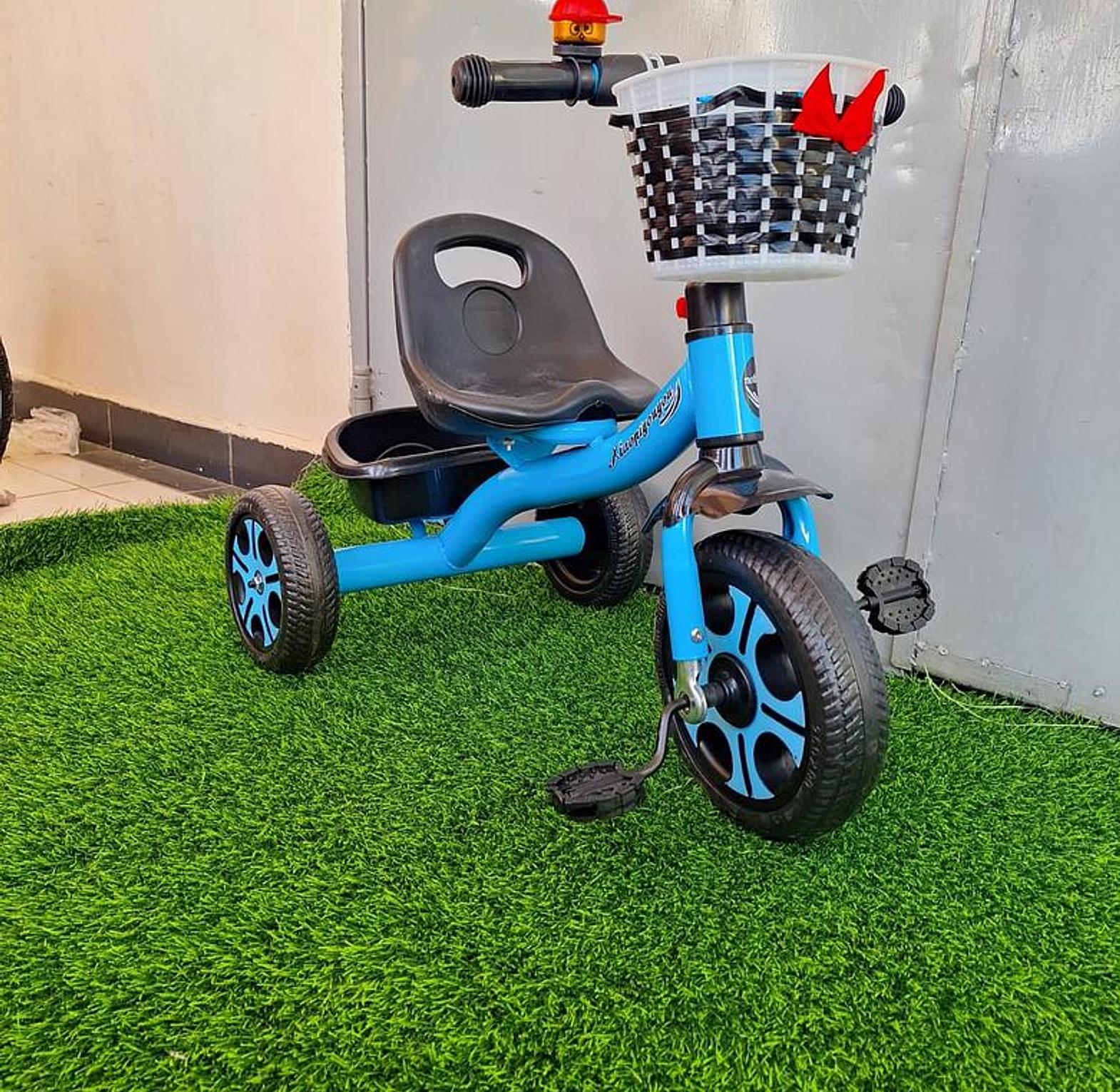 This is a three-wheeled ride-on toy designed for toddlers and young children, combining the stability of a tricycle with the added convenience of a parental push handle for steering and guidance. It features a comfortable seat, non-slip pedals, and a rear storage basket for carrying items.