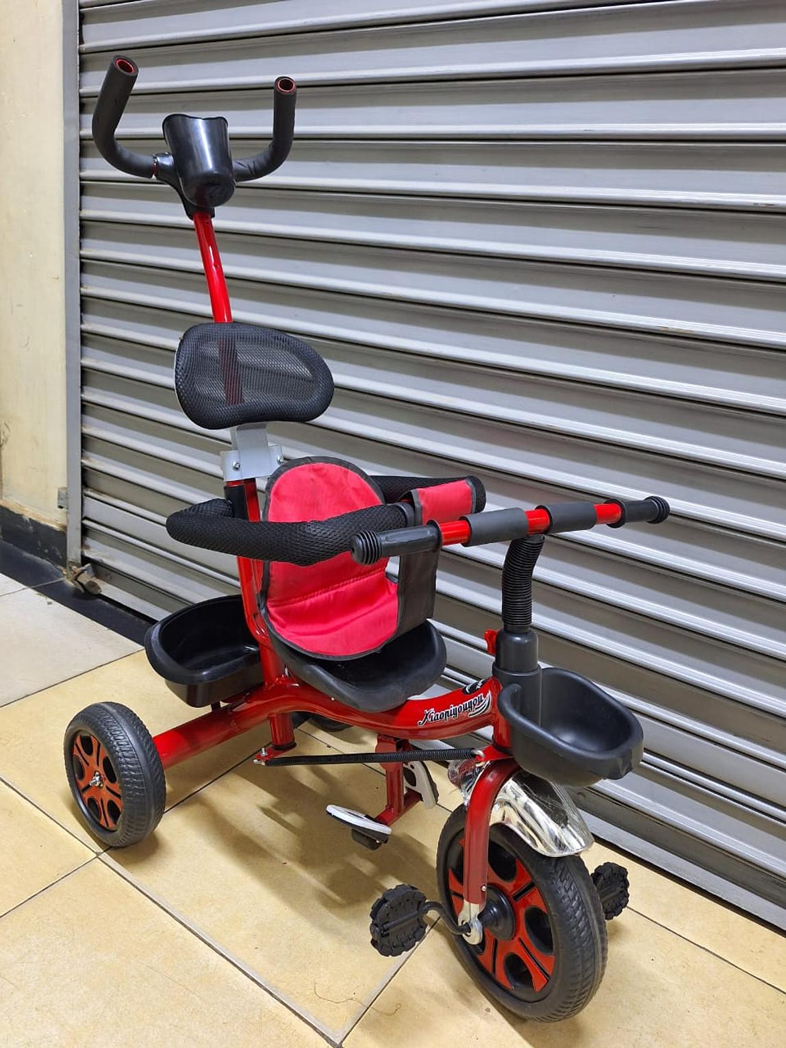 Has a push handle Portable Adjustable handle Has resting legs pedals for babies Has cycling pedals