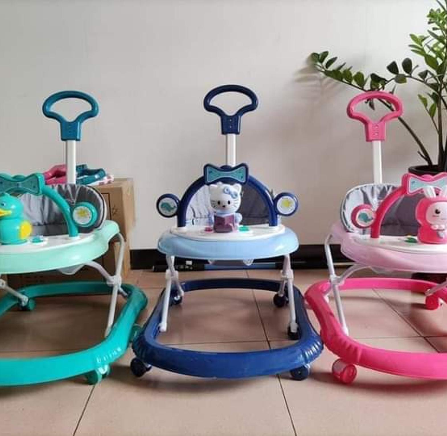 Function: This multifunctional walker helps babies take their first steps with confidence, offering support and entertainment. It gives a child a sense of independence while allowing parents to guide them using the included push handle. Design: The walkers feature a sturdy frame, a comfortable high-back seat, and a removable toy tray. They are available in various colors and designs, such as the duck, Hello Kitty, and bunny themes visible in the image. Entertainment: The removable toy tray is battery-operated and features a variety of musical tunes and interactive toys to stimulate the baby's senses.