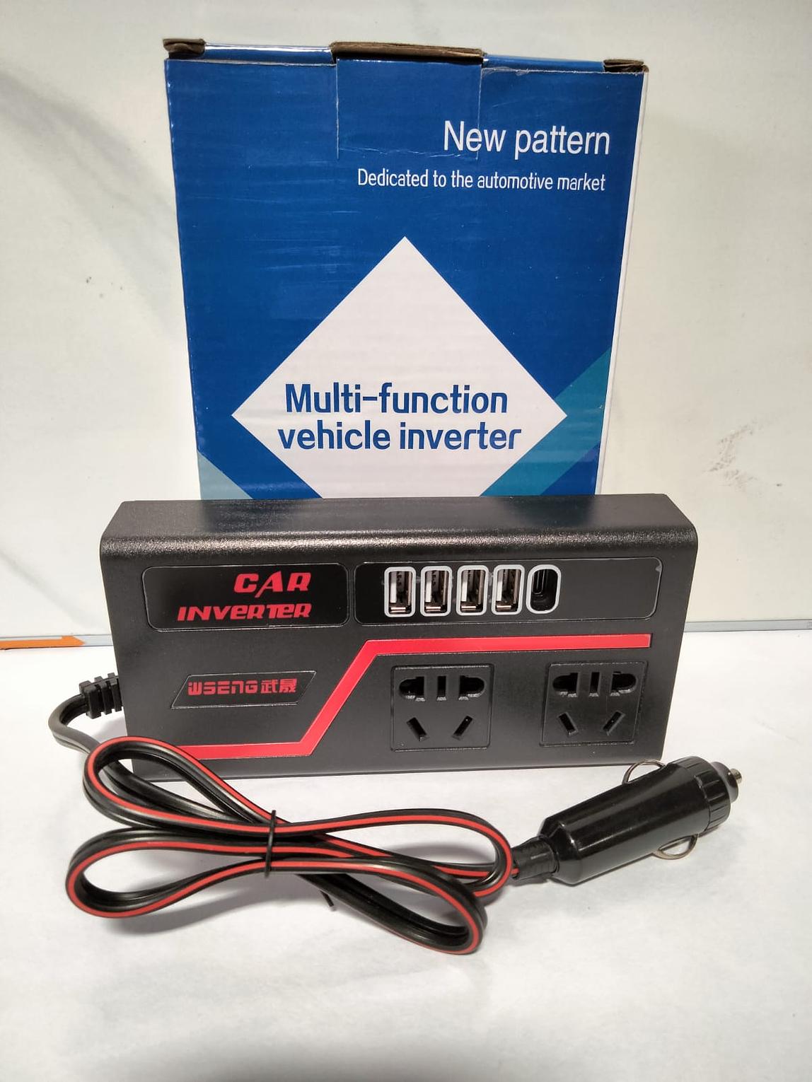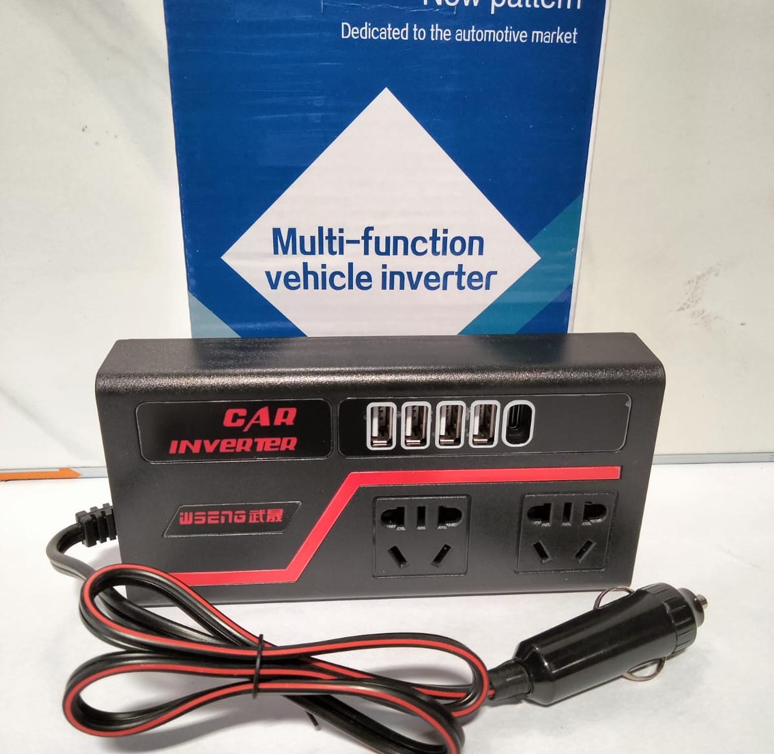 multi-function vehicle power inverter designed to convert a vehicle's DC power to AC power and provide USB charging ports.