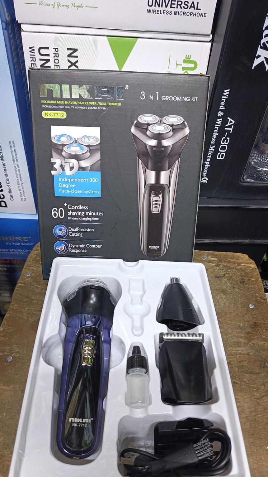 Name: Nikai 3 in 1 Grooming Kit Model: NK-7712 Functionality: This kit serves as a rechargeable shaver, hair clipper, and nose trimmer, offering a versatile grooming solution.