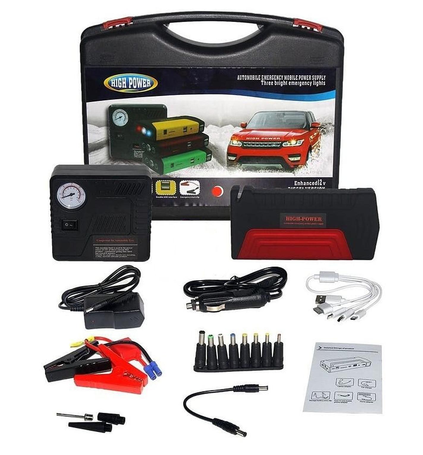 Buy today this Emergency Car Jump starter Kit. High Capacity battery power bank 280000mAh .Automated tyre inflator complete with a pressure gauge in psi.Inflates also bicycles, balloons, balls Can charge both android and iPhone/ iPad via USB connection Charges a wide range of other electronics like cameras, laptops, play stations etc Voltage selector between 12, 16 & 19 volts. Power bank battery can be charged both from AC mains and the car lighter ports. Very bright torch. Emergency strobe/ hazard lights Light weight; only 450 gms. Reasonably priced Emergency Car Jump starter Kit. High Capacity battery power bank - 280000mAh Automated tyre inflator complete with a pressure gauge in psi. Inflates also bicycles, balloons, balls. Can charge android and iPhone/ iPad via USB connection .Charges a wide range of other electronics like cameras, laptops, play stations etc Power bank battery can be charged both from AC mains and the car lighter ports. Very bright torch. Emergency strobe/ hazard lights. Light weight; only 450 gms.