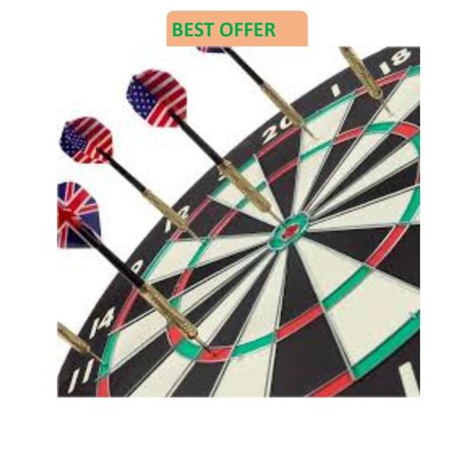 With a complete staple-free dartboard wire system, the scoring area of the Assassin Pro dart boards is 15% larger than that of regular dartboards. Reduce your bounce-outs and boost your scores with the cutting-edge, ultra-slim segmentation system that’s 65% thinner than the conventional round wireframe.The user-friendly mounting kit includes all the hardware and instructions you need to secure your bristle dartboard in no time. With a darts oche tape for accurate setup, this ready-to-use darts board set offers you a stress-free experience.The sturdy brass steel tip darts set in this bundle are easy to carry and store in its innovative case with magnetic closure. The uniquely-designed box features a custom-made EVA foam insert to protect your darts set from scratches. This professional darts steel tip set contains darts of 22g with strategically-knurled brass barrels that will offer you optimum grip, lift, and stability. The steel darts are fitted with rubber O-rings to avoid the shafts from loosening. Our dartboard and darts set also contain a dart sharpener that will help you minimize bounce-outs by keeping the tips of your darts sharp.
