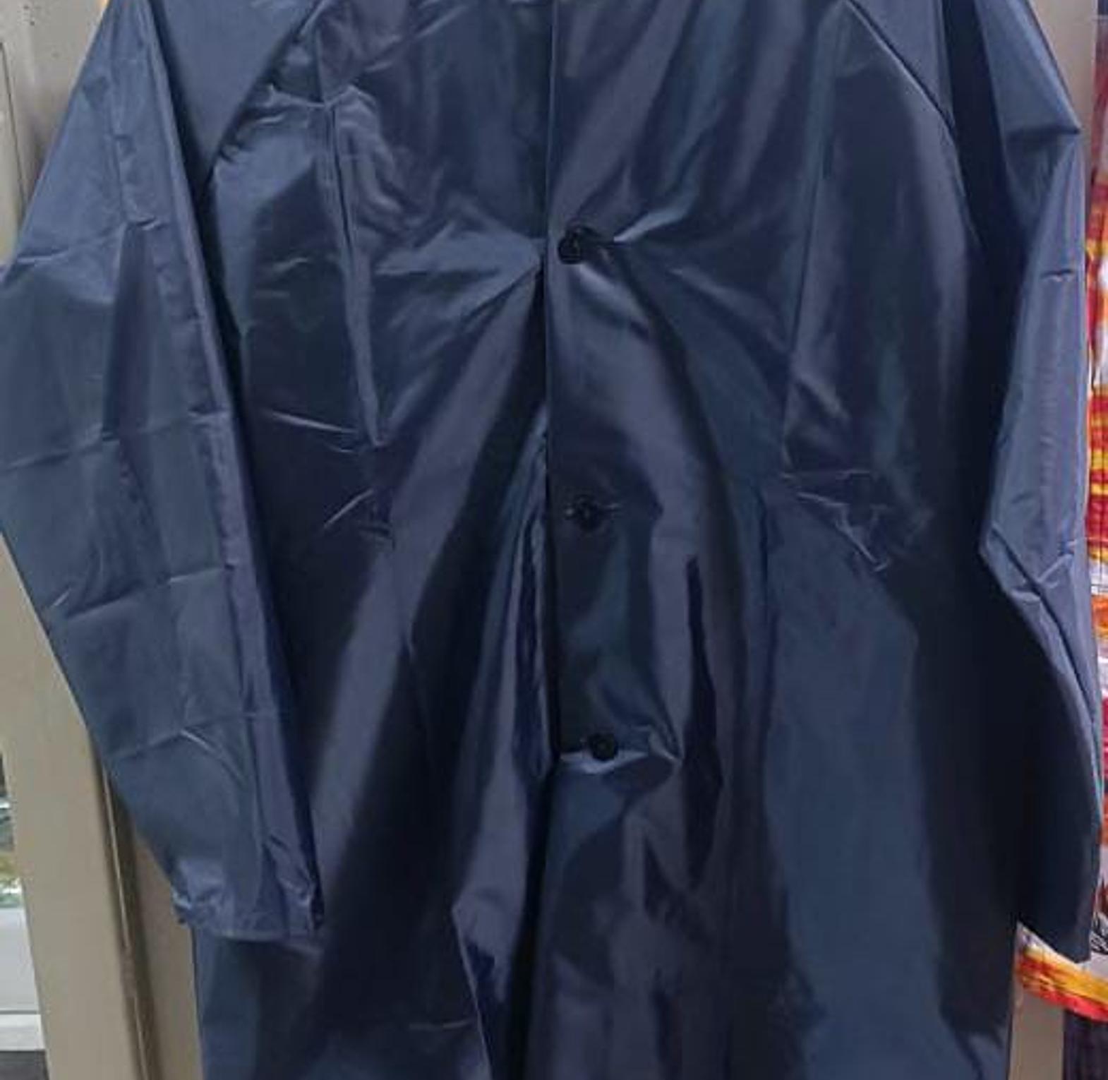 Style: It features raglan sleeve styling and a press-stud (snap) front closure. The coat has a hood, likely with an adjustable drawcord, but typically comes without a lining or pockets. Color: Navy blue. Design: The seams are heat-sealed to ensure waterproofness, and there is double top-stitching throughout.