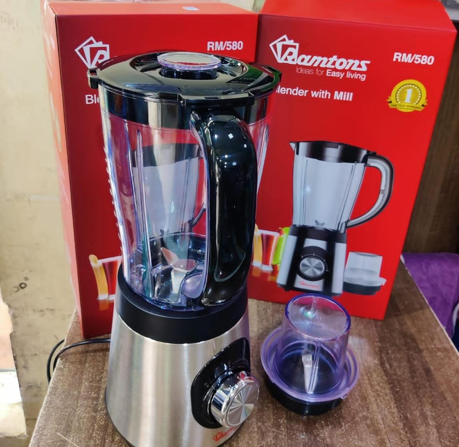 The Ramtons RM/580 is a versatile, 2-in-1 kitchen appliance featuring a sleek stainless steel finish. It is designed for both liquid blending—ideal for smoothies, juices, and sauces—and dry grinding via its dedicated mill attachment, which can handle coffee beans, spices, or nuts