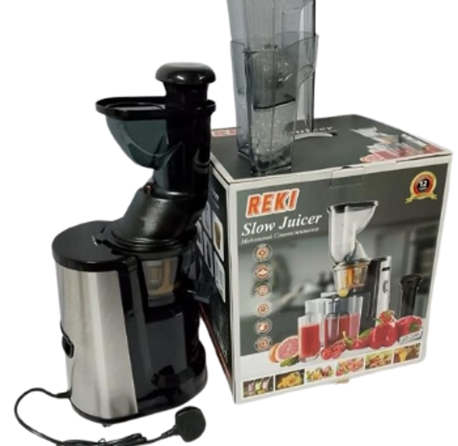 The REKI Slow Juicer uses cold-press (masticating) technology to gently crush and squeeze fruits and vegetables at a low speed. This process minimizes heat buildup and oxidation, which helps preserve essential vitamins, enzymes, and natural flavors for a more nutrient-dense juice compared to traditional high-speed centrifugal juicers. It features an automatic separation system that delivers smooth juice into one container while ejecting bone-dry pulp into another