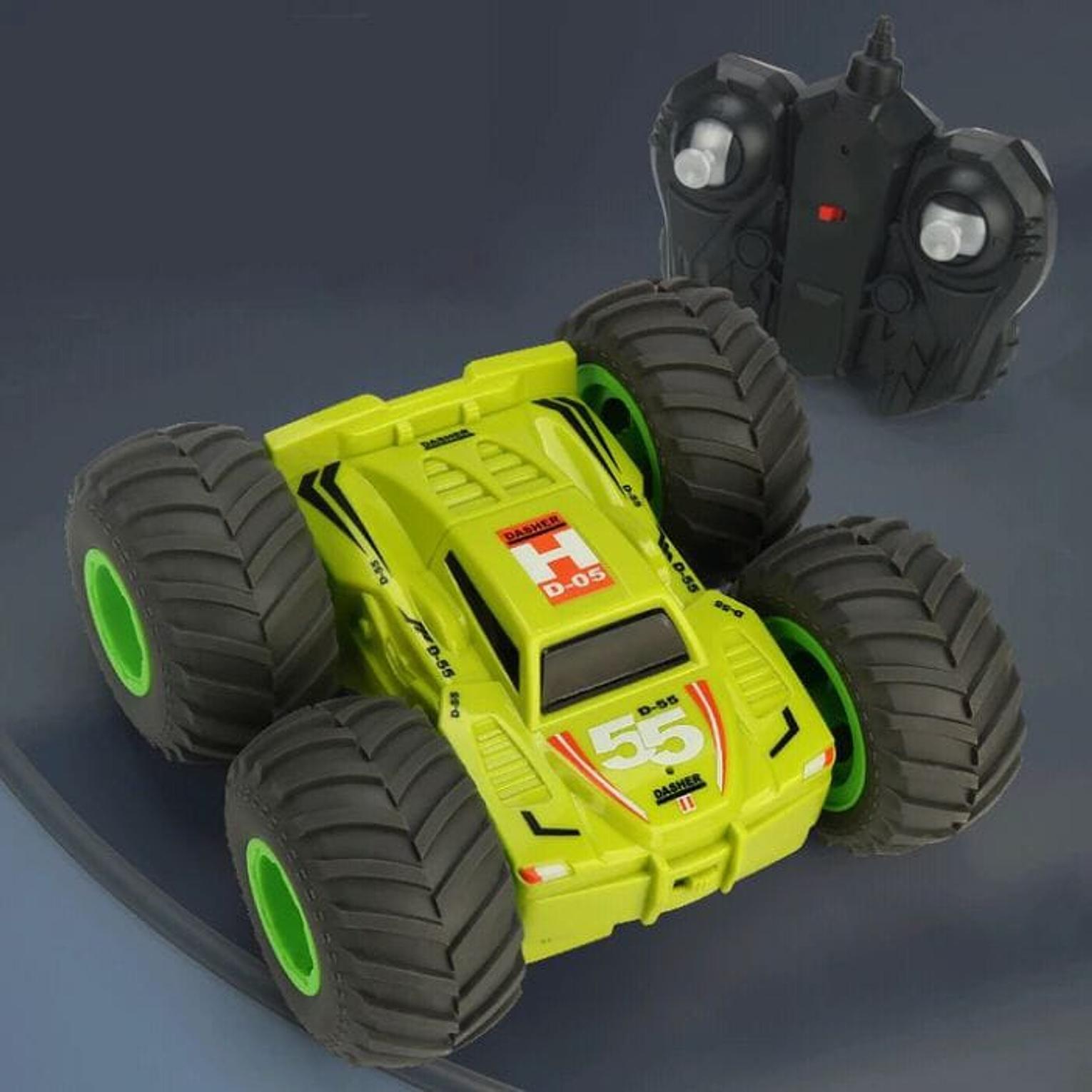 t is a remote control car designed for performing stunts, indicated by its robust build and large wheels suitable for off-road or varied terrains. The car features a bright lime green body with black and green wheels, and it comes with a separate remote control unit. Markings such as "DASHER" and "D-55" are visible on the car's body.
