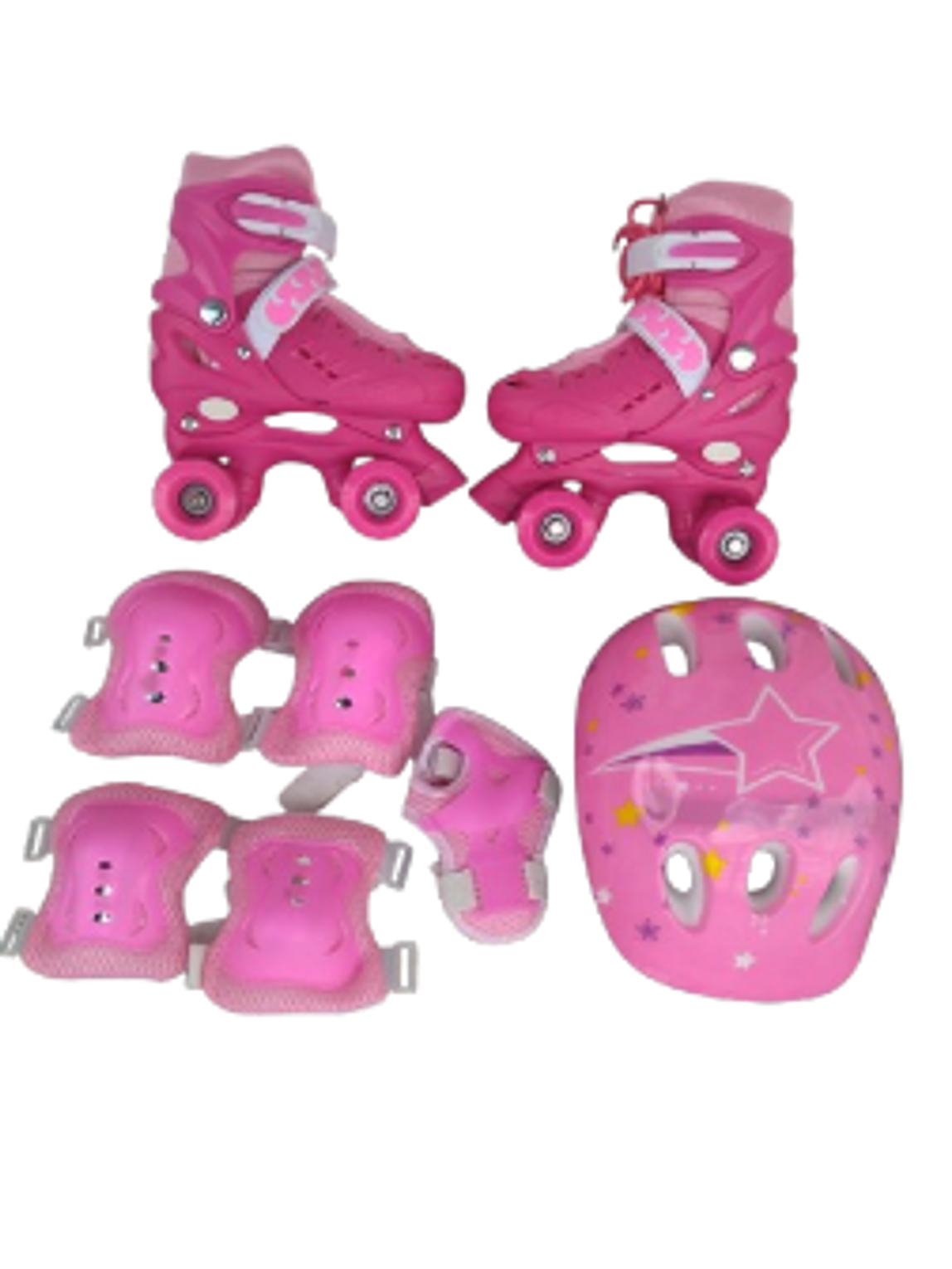 Quad Skates: The skates have four wheels arranged in two parallel rows for stability, which is suitable for beginners. The boots are pink with white straps and buckles for a secure fit. Protective Gear: The set comes with matching pink protective pads for the knees, elbows, and wrists to ensure safety while skating. Helmet: A pink helmet with a star pattern is included, providing head protection.