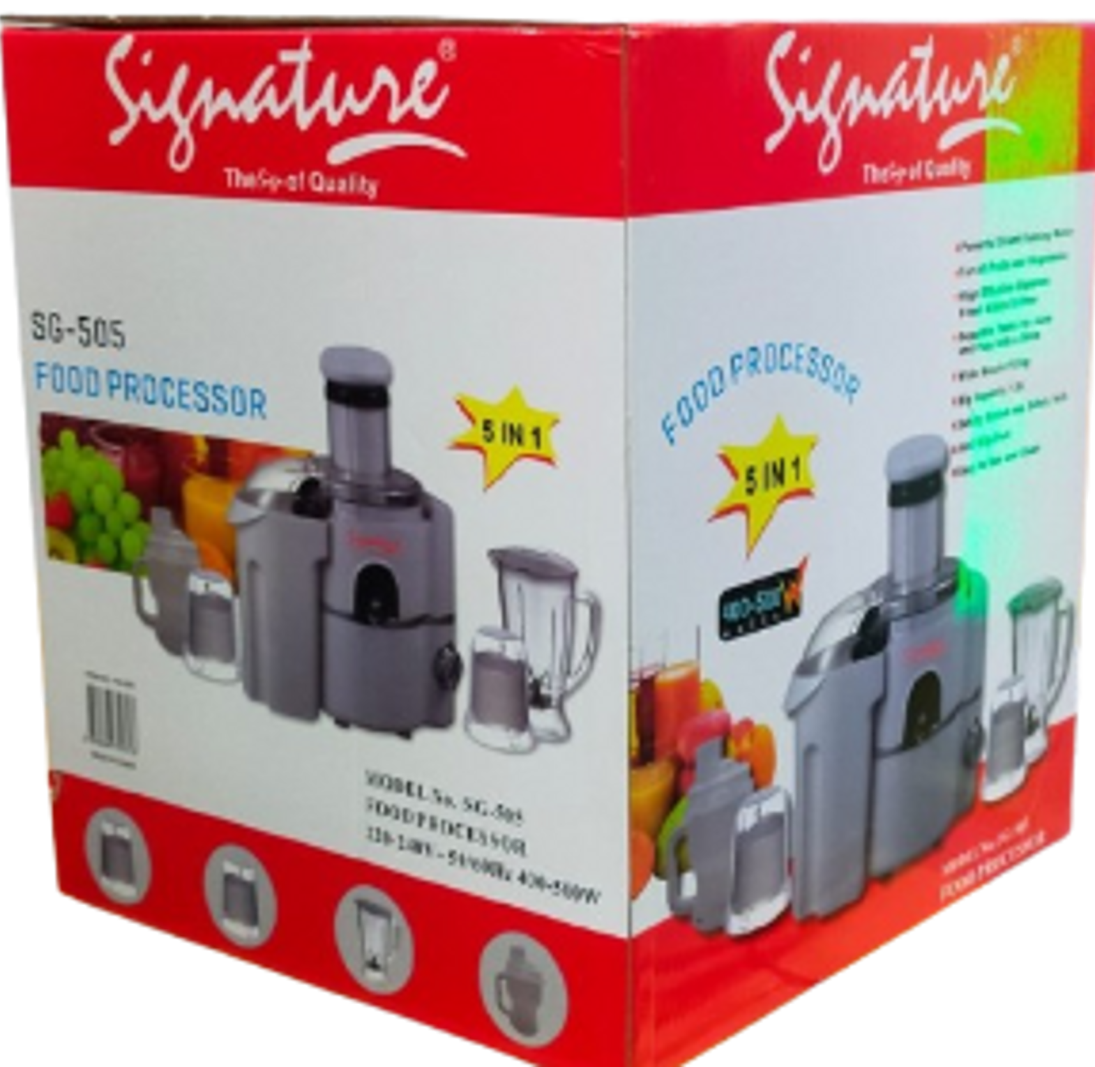 This SIGNATURE juice extractor extracts juice from citrus fruits, vegetables by shredding the flesh of the food item and any kinds of fruits such as Apples, Watermelon, Carrots, vegetables etc. It's great for making ice-cold smoothies or hot soups. To make things even easier and to help you save space in your kitchen. Both the bowl and the blender can be run from a single drive. Juice Extractor has 2 speeds for soft and hard fruit and vegetables.