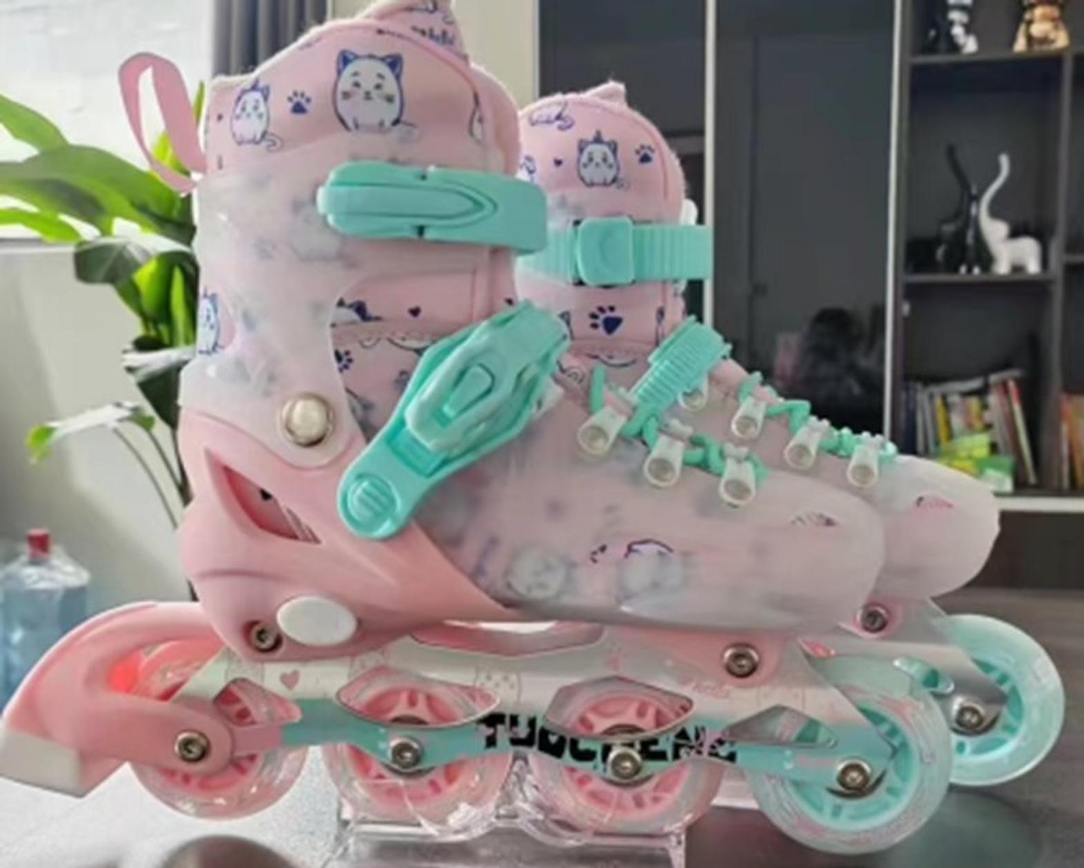 These are pink inline skates designed for children, featuring a hard boot for support and stability, and a soft, padded lining with a cat-themed pattern for comfort. They are typically adjustable in size to accommodate growing feet and feature buckle closures for a secure fit. The skates are equipped with inline skate wheels, often made of polyurethane, and may include flashing LED lights, particularly in models targeting beginners or younger children