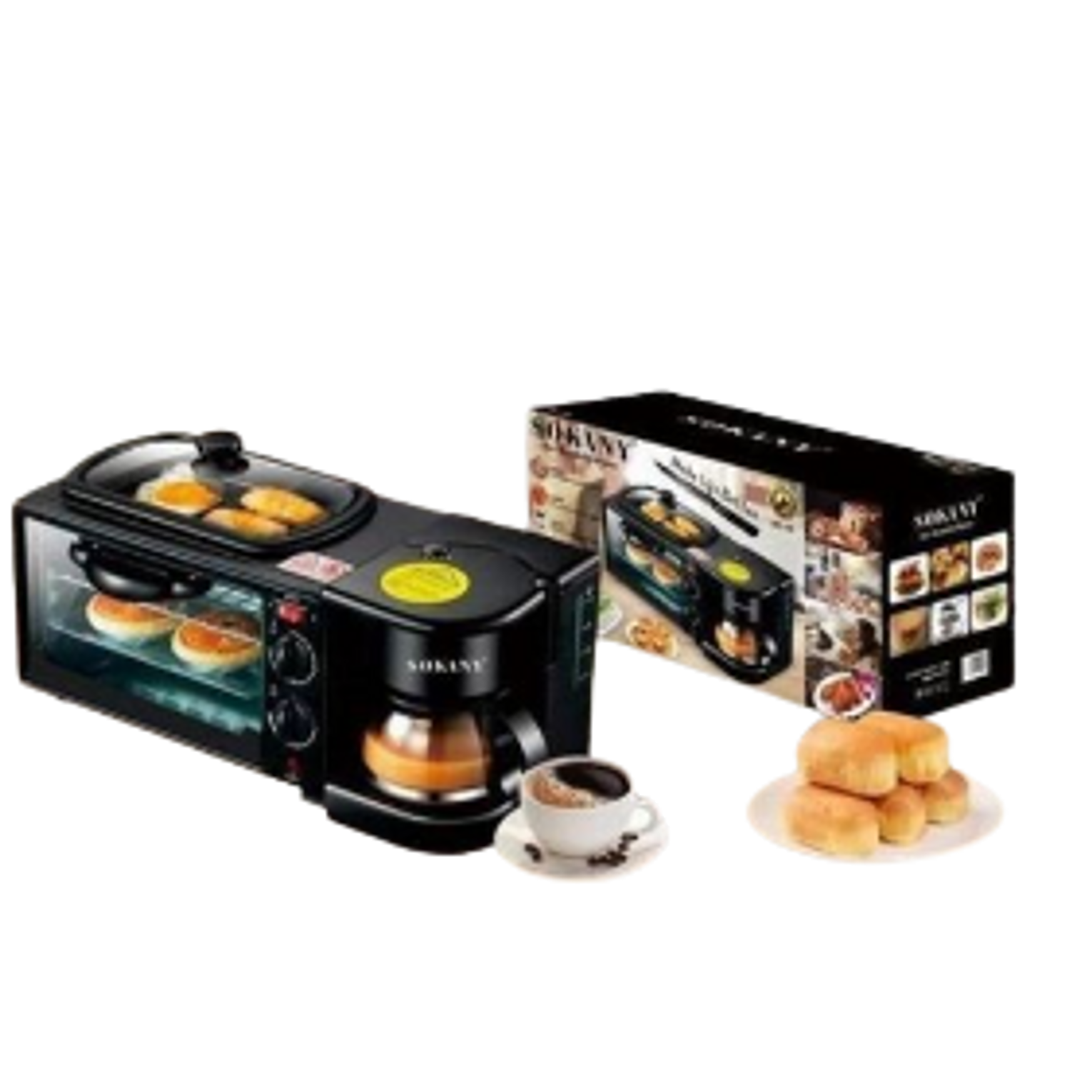 Multi functional Electric 3 in 1 Breakfast Oven and Coffee Maker. This appliance can toast bread, cook fried eggs, sausages, meat, bakes pies, pizza and cook coffee or tea simultaneously. This multi function over is perfect to boil and reheat foods quickly .Makes a complete breakfast with just one compact appliance! Enjoy a cup of coffee with the three-cup coffee maker, while cooking eggs and meats on the non-stick griddle
